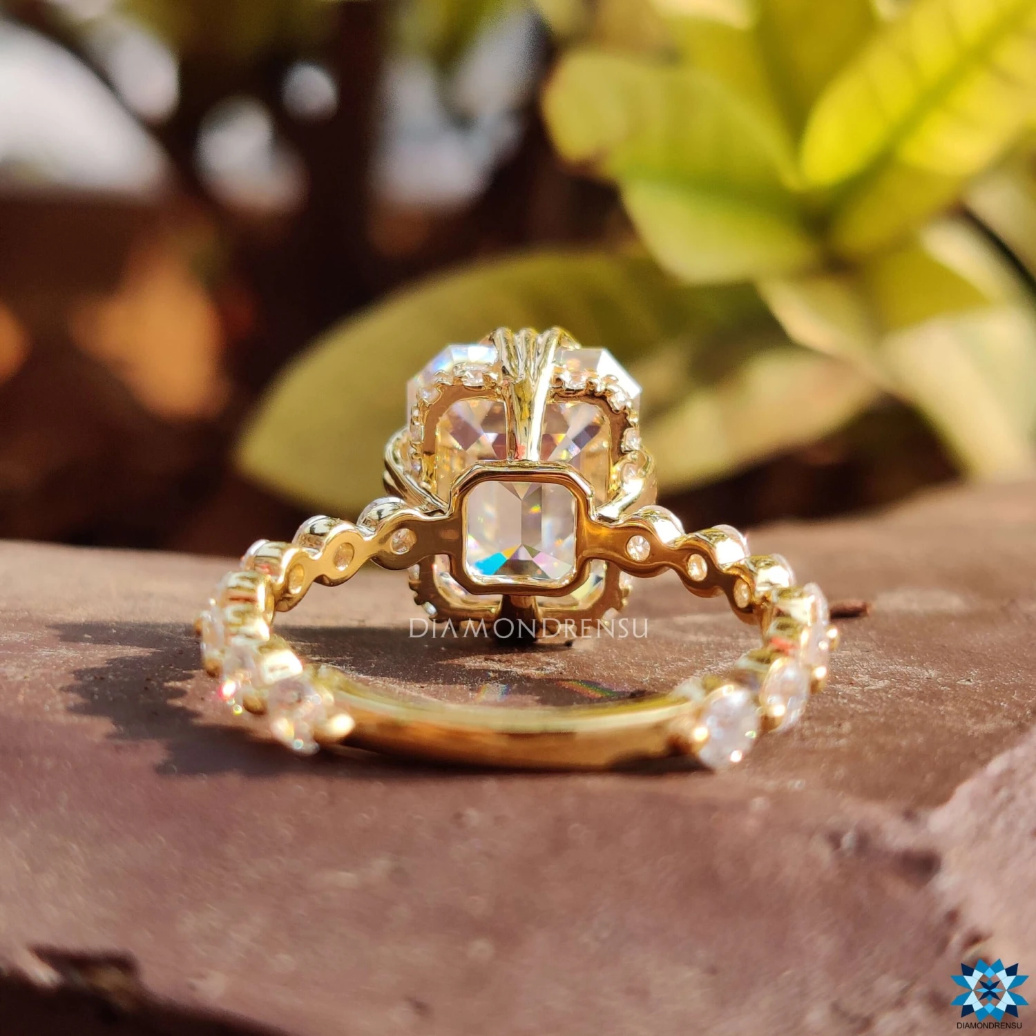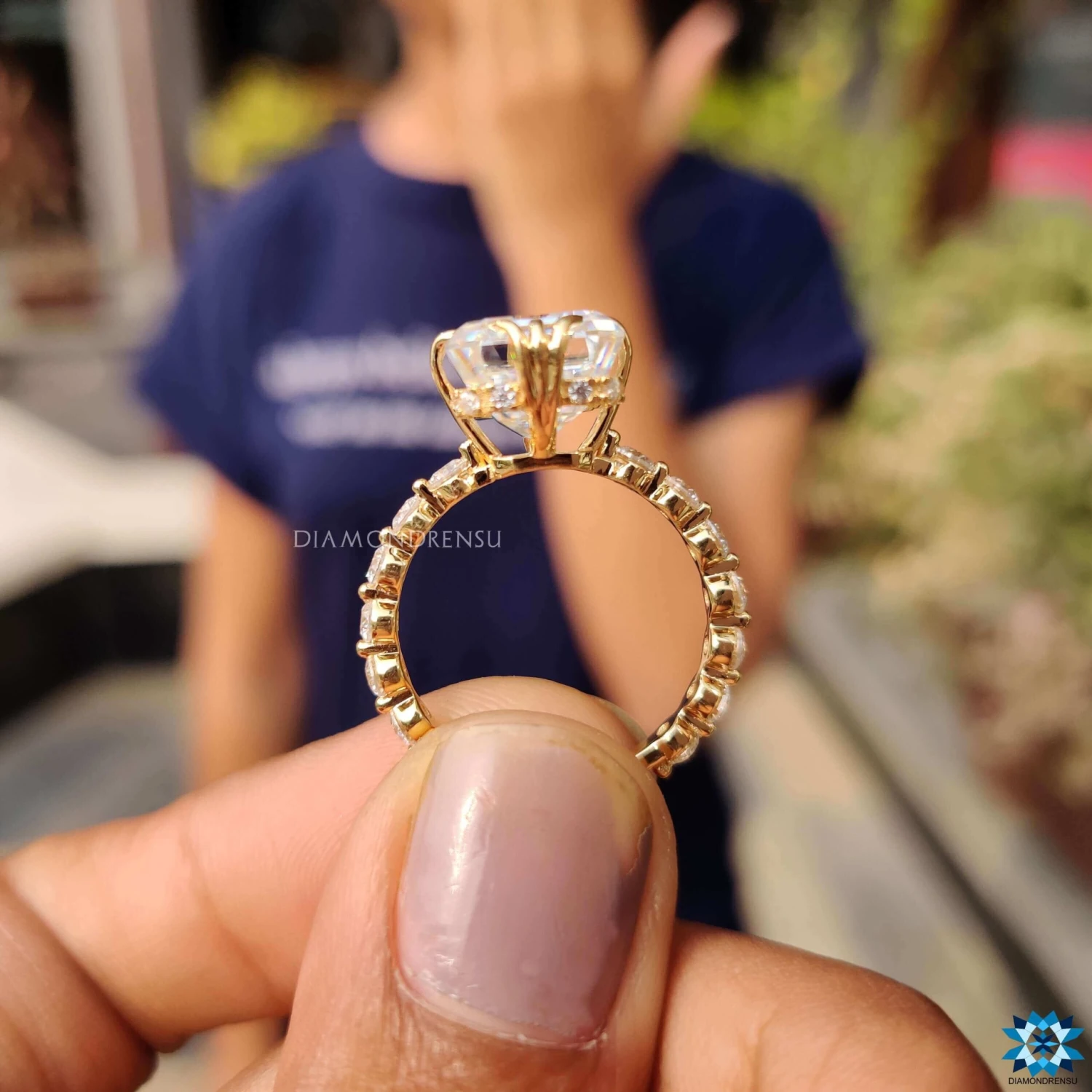 This gorgeous moissanite vintage engagement ring comes with the center beauty of emerald step cut moissanite stone safely captured by fishtail prongs. That gives a unique look to the engagement ring. In addition, small round cut stones are set in floating bubble prongs around the shank.