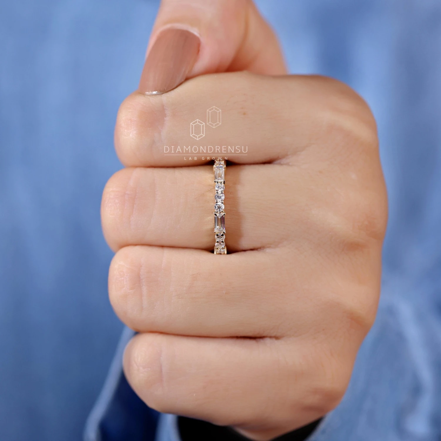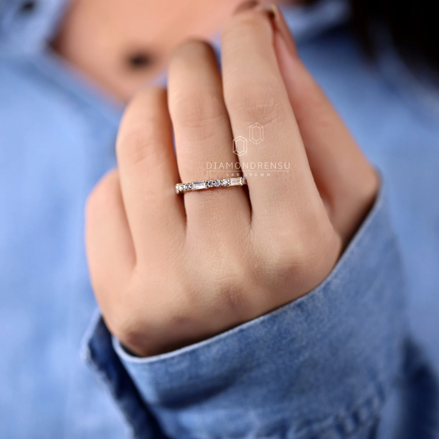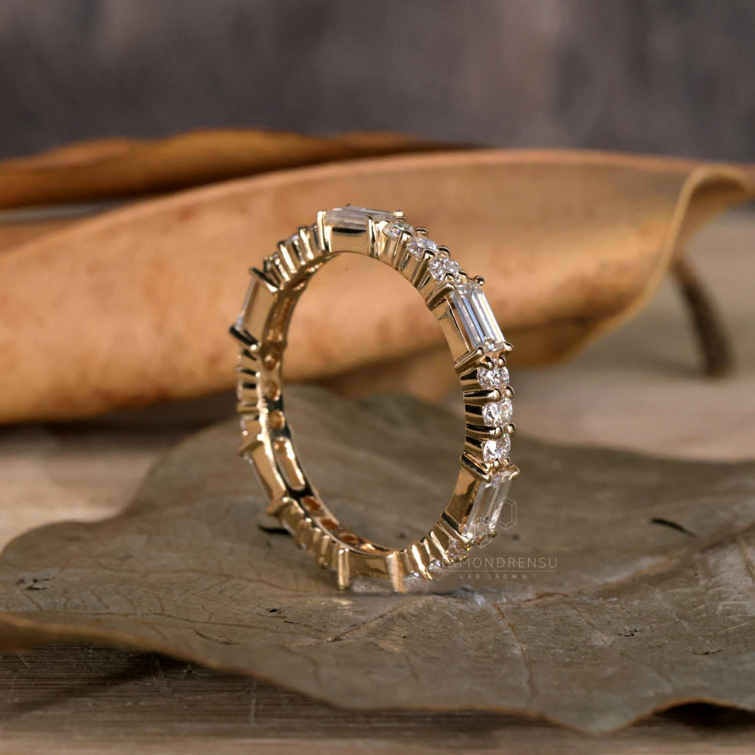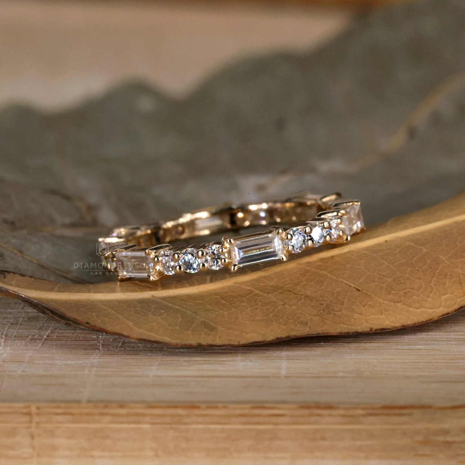 Eco friendly diamond eternity band is the perfect gift for your eternal love. The listed diamond wedding band features the sparkling beauty of round and baguette-cut. A baguette diamond and a round brilliant cut diamond are alternately set on the shank, which is added a modern touch to the band.