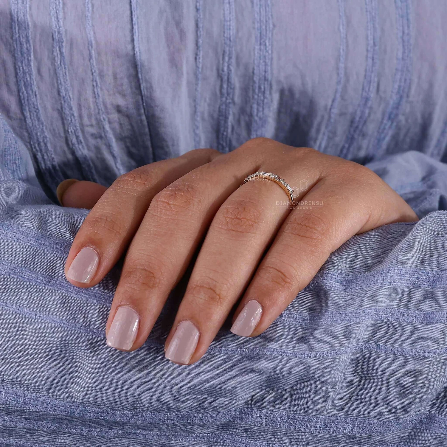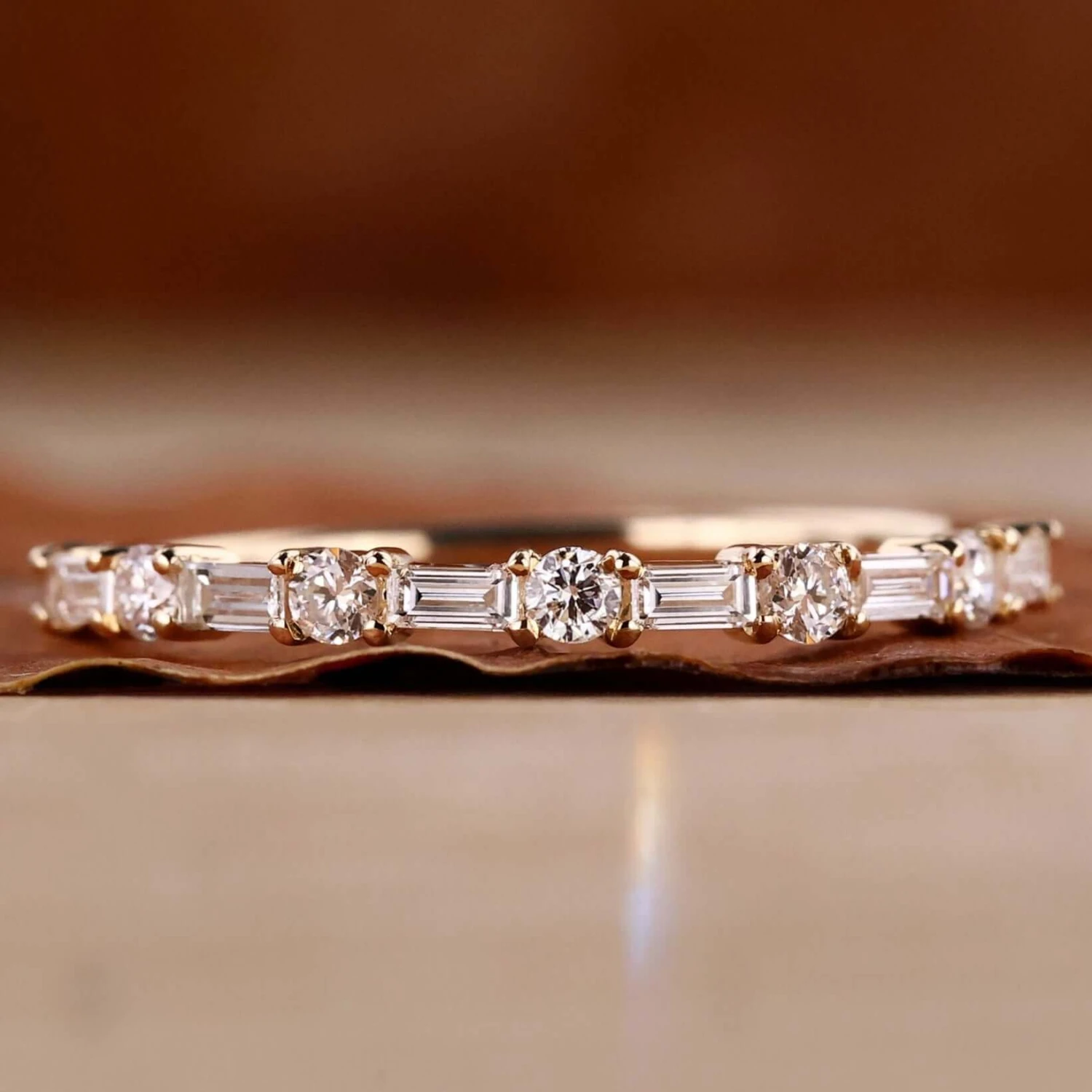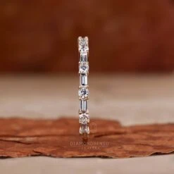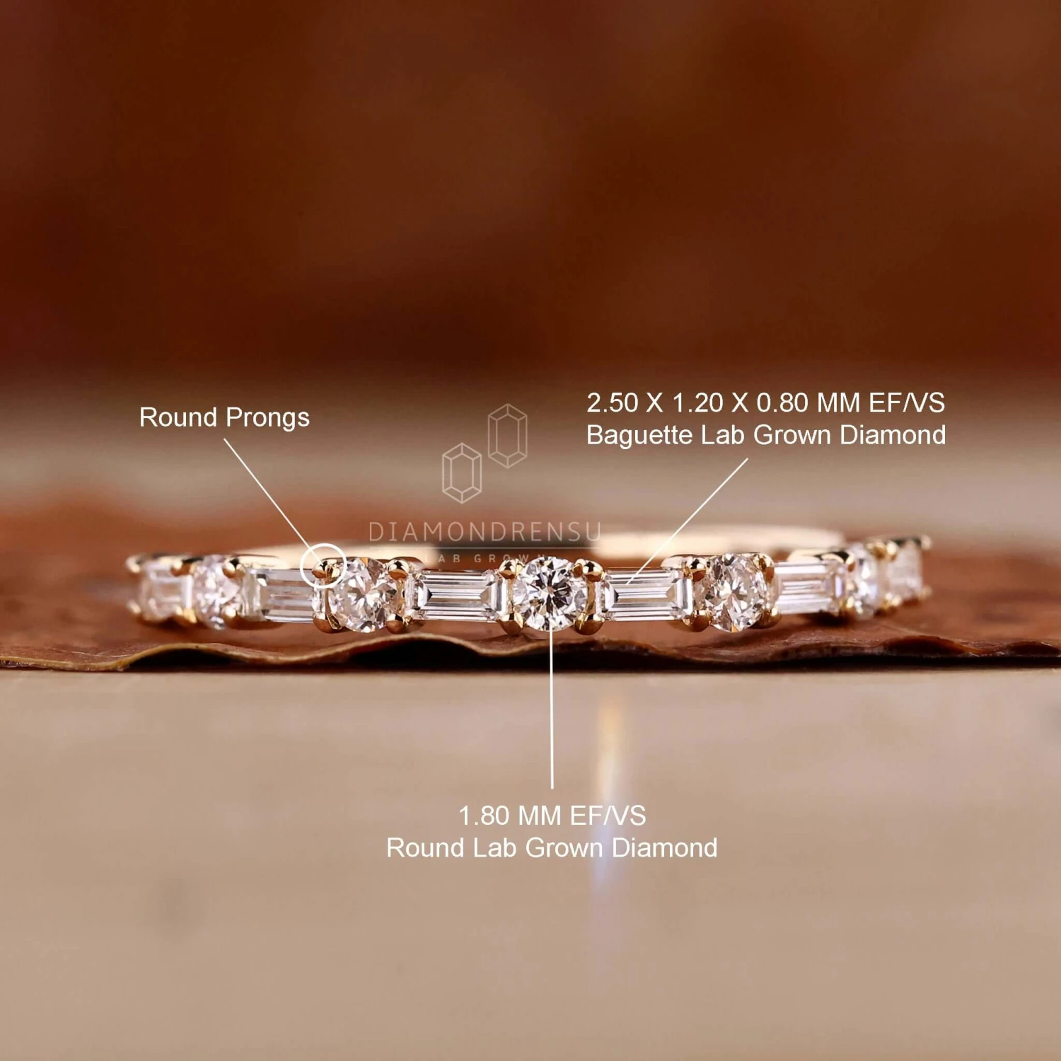 Enhance your wedding set with the stunning Baguette and Round Lab Grown Diamond Alternating Eternity Wedding Band. This 0.16 ct lab-created diamond band is the perfect match for your engagement ring. Handcrafted by Diamondrensu, this stackable band adds a touch of elegance and sophistication to your special day. Celebrate your love and commitment with this beautiful and ethically sourced wedding band.