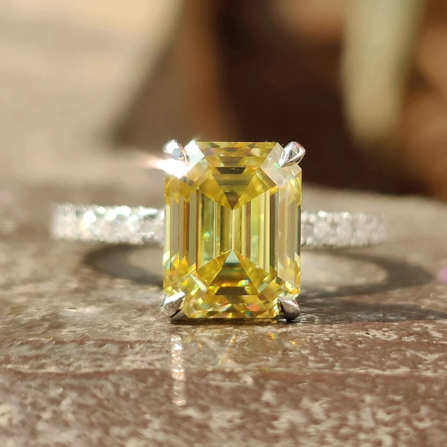 Be the first to review “Canary Vivid Yellow 3.82 TCW Emerald Cut Unique Moissanite Engagement Ring” Cancel reply