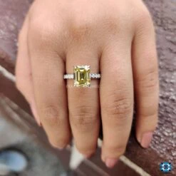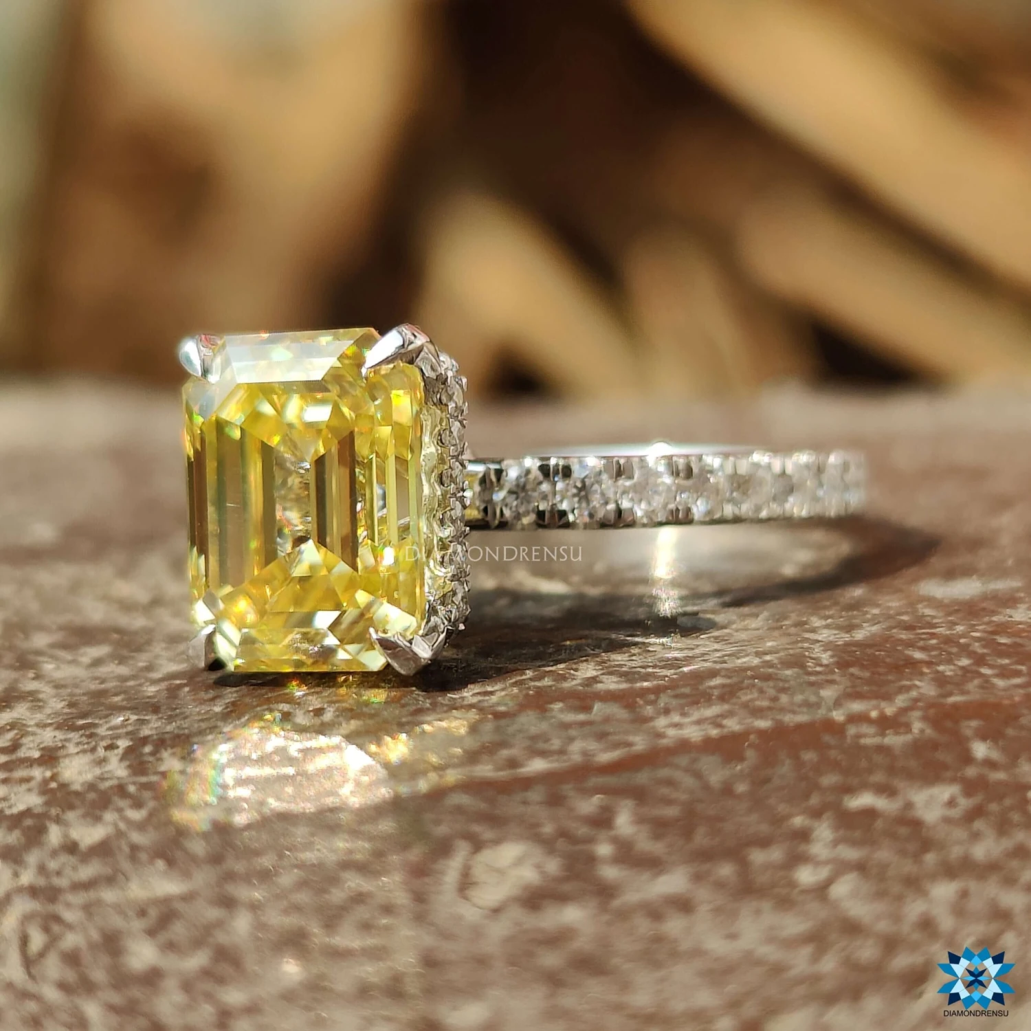 This fancy moissanite engagement ring features center beauty of elegant canary yellow emerald step-cut moissanite diamond gives a unique sparkle and looks classic with a side halo pave set of little colorless round brilliant cut moissanite diamond