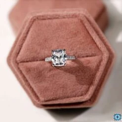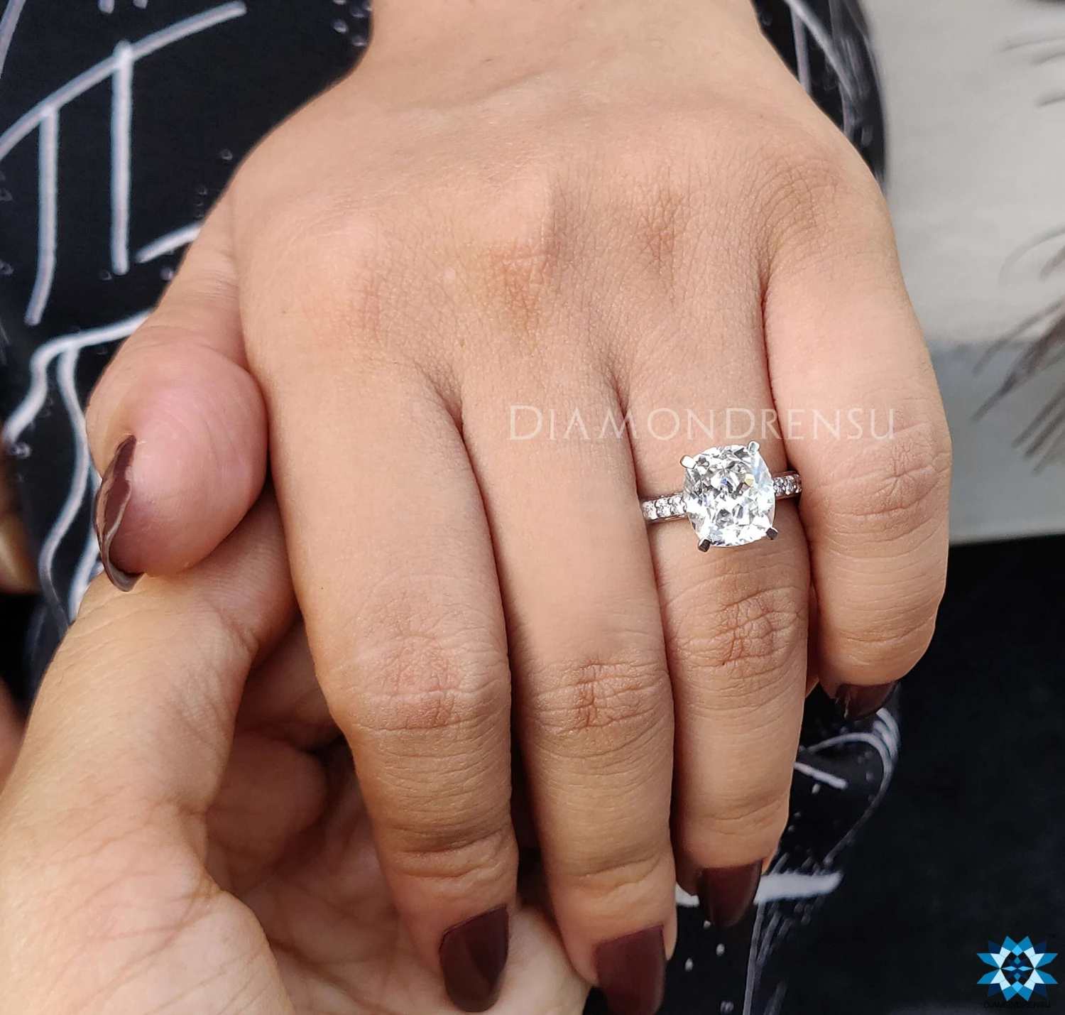 This affordable moissanite engagement ring features a cushion divine moissanite beautifully held in four prongs. Additionally, pave set of tiny round cut stones placed on the shank gives extra sparkle. Moreover, this ring also comes with a cathedral setting. The cathedral setting is the most popular choice for all the people, another thing is that this particular setting gives support to the heald part of the ring.