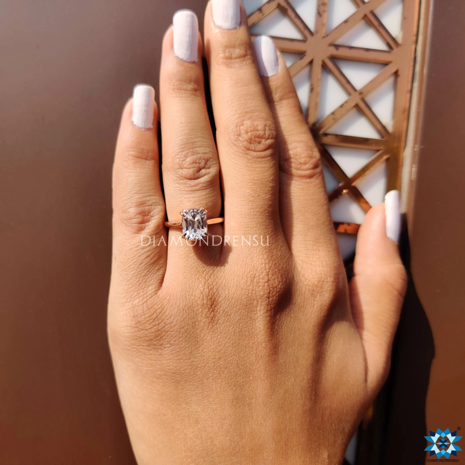 This stunning solitaire engagement ring features a double claw prong setting catches center cushion cut moissanite diamond perfectly and a cathedral setting adds an extra shine to the ring
