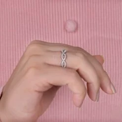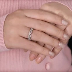 Lab grown diamond eternity wedding band is here for the best valentine’s day gift for your loved one. An infinity twisted design representing endless love decorates this white gold band with a bead pave set. A stunning ring made with lab created diamonds grabs everyone’s attention.