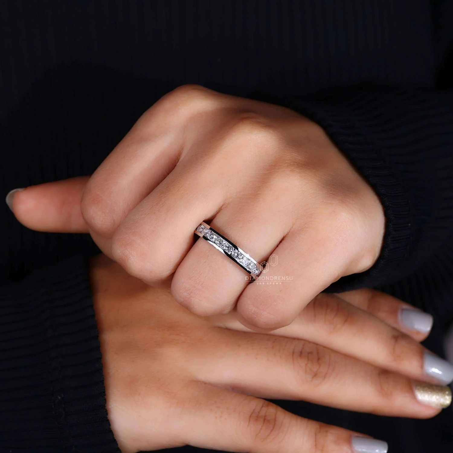 This stunning eternity wedding band is crafted from channel-set round-cut lab-grown diamonds, making for a unique and truly special piece that is both eye-catching and timeless. The matching band design is both stackable and perfect for pairing with engagement rings, making it a versatile choice for any special occasion.