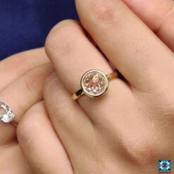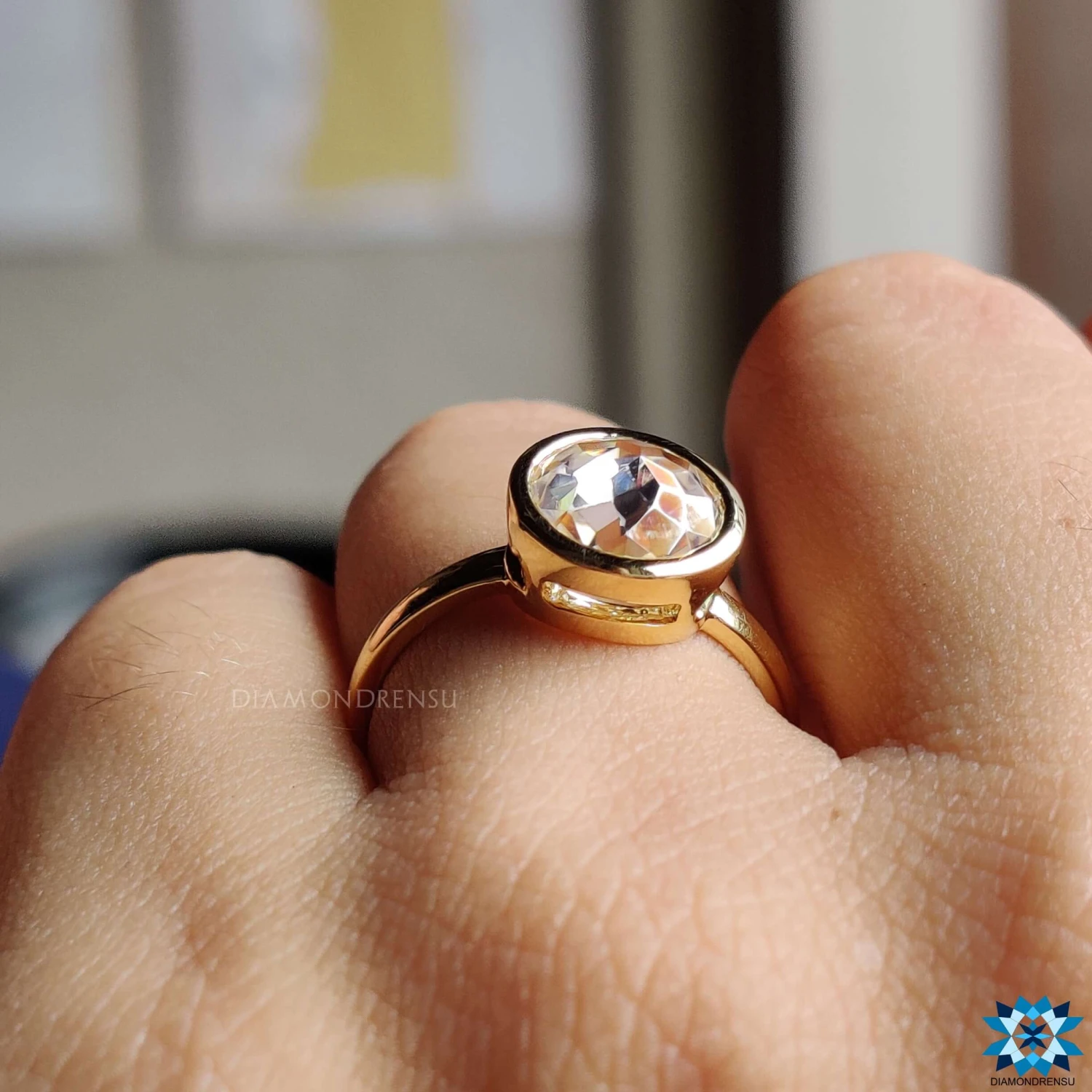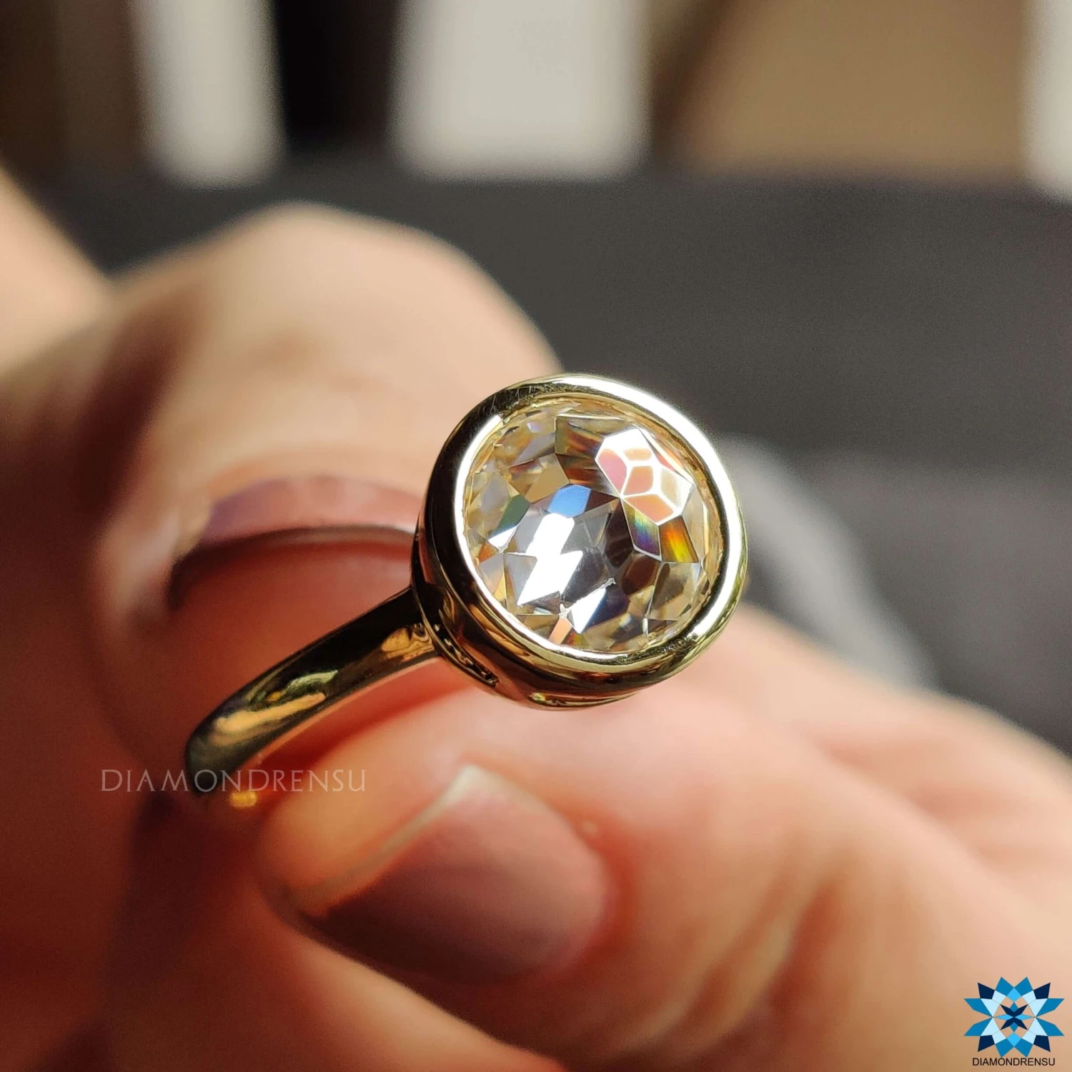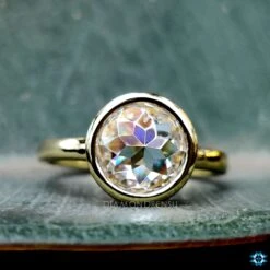 This listed simple moissanite solitaire ring features a center colorless round rose cut. The center stone is classically covered by a classic metal outline of a bezel set of precious yellow gold. The additional open gallery, setting allows you to see the center stone from top to bottom and flanks unique shine to the ring.