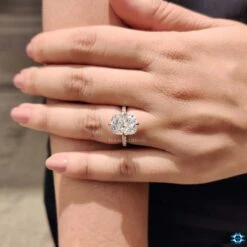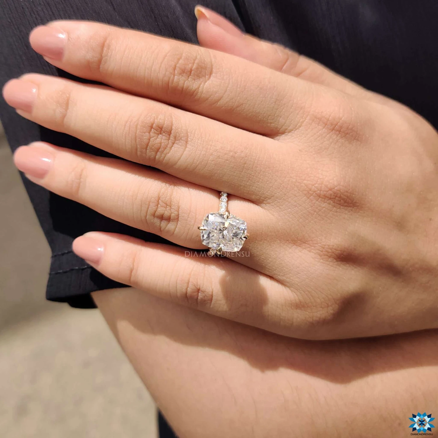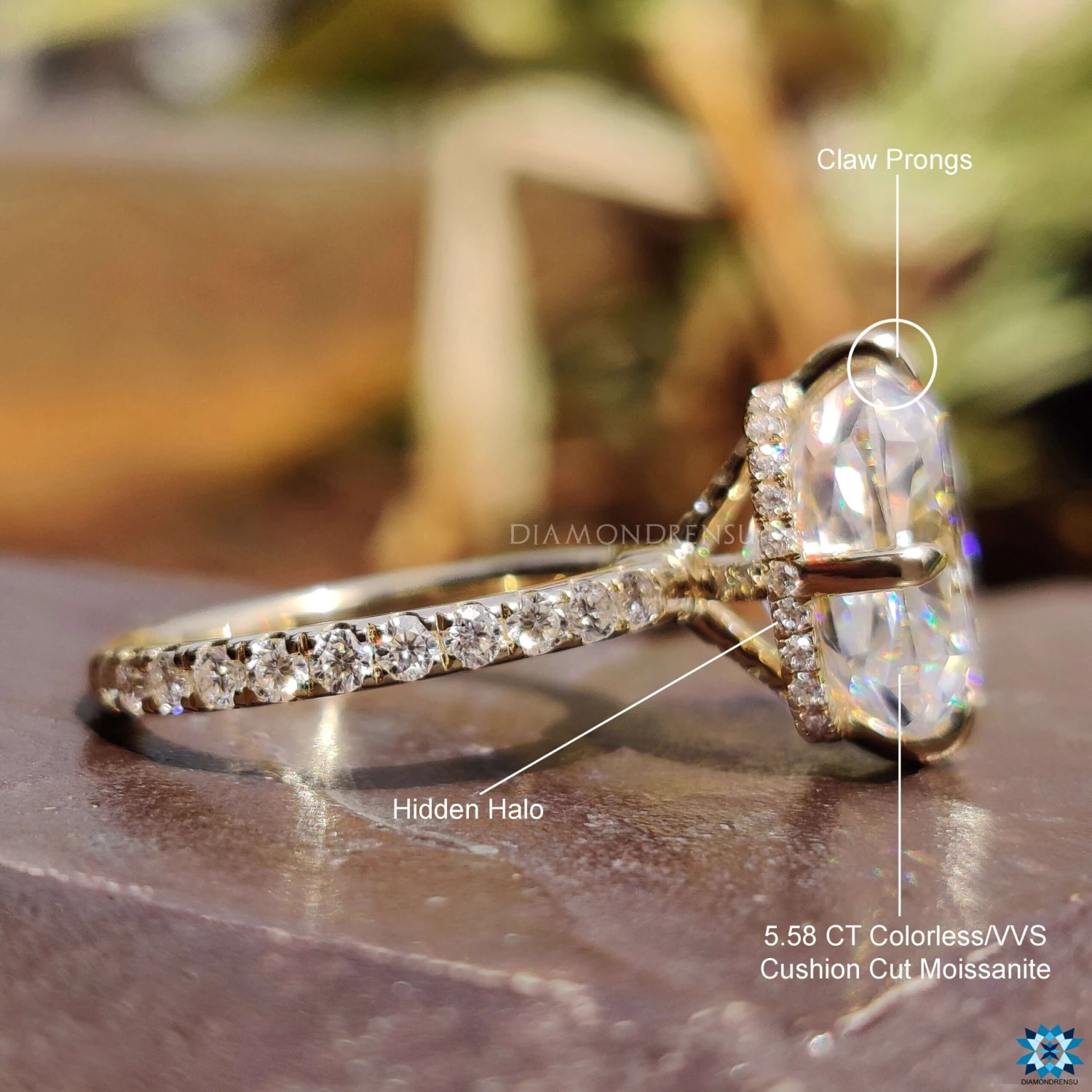The compass point prong setting cushion moissanite halo engagement ring is here for you. This elegant moissanite ring features a beautiful cushion cut with a hidden halo setting of minimal round moissanite. This unique design makes it stand out from other moissanite rings in this price range and makes it perfect for both engagement and wedding bands.
