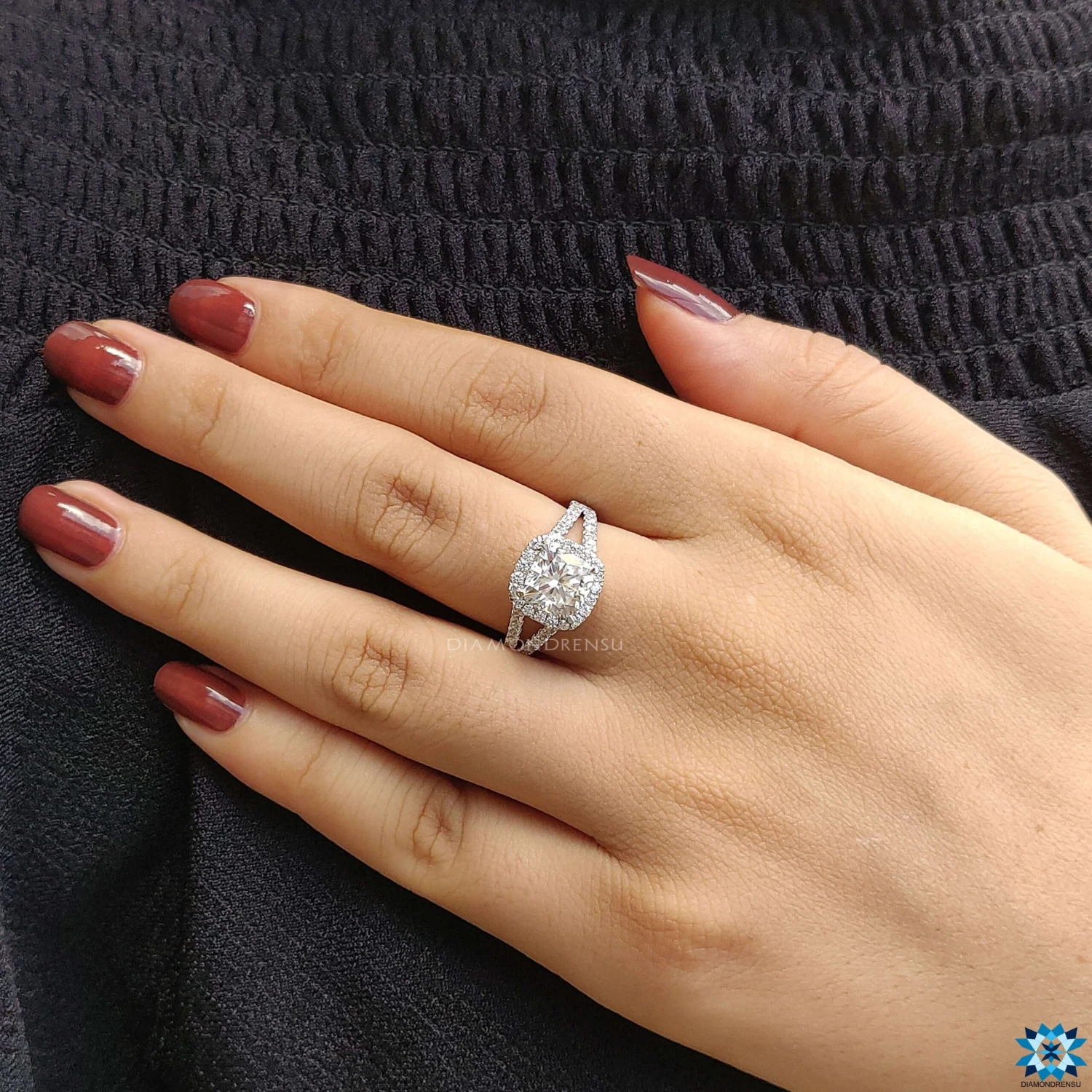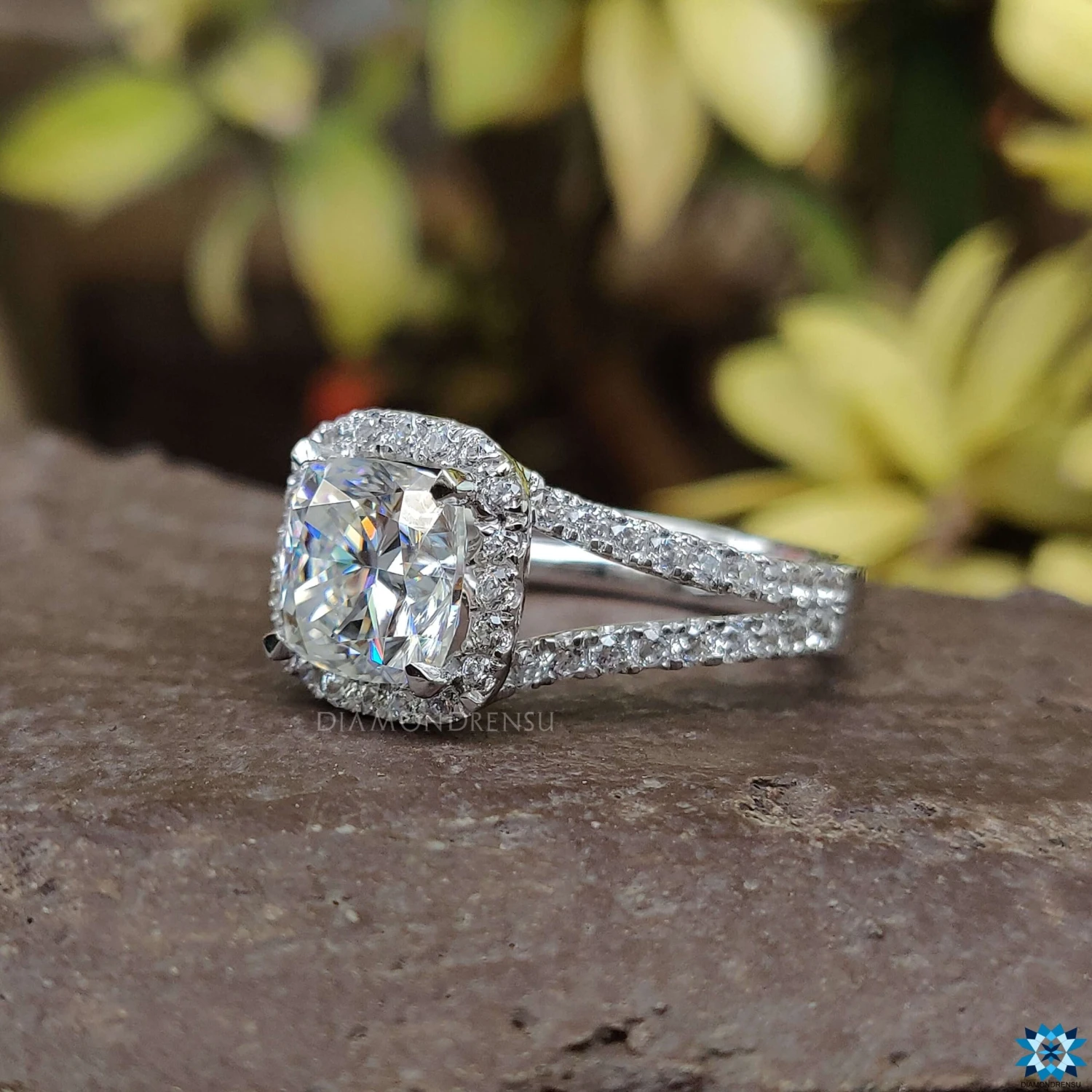 This is the perfect split shank engagement ring for those who have a luxurious sense of style and love making a bold statement. Wear this ring with pride, as the sheer brilliance of this split band engagement ring, is sure going to turn heads wherever you wear it. The design and craftsmanship of this ring have made it one of our best-selling split shank moissanite rings at Diamondrensu.