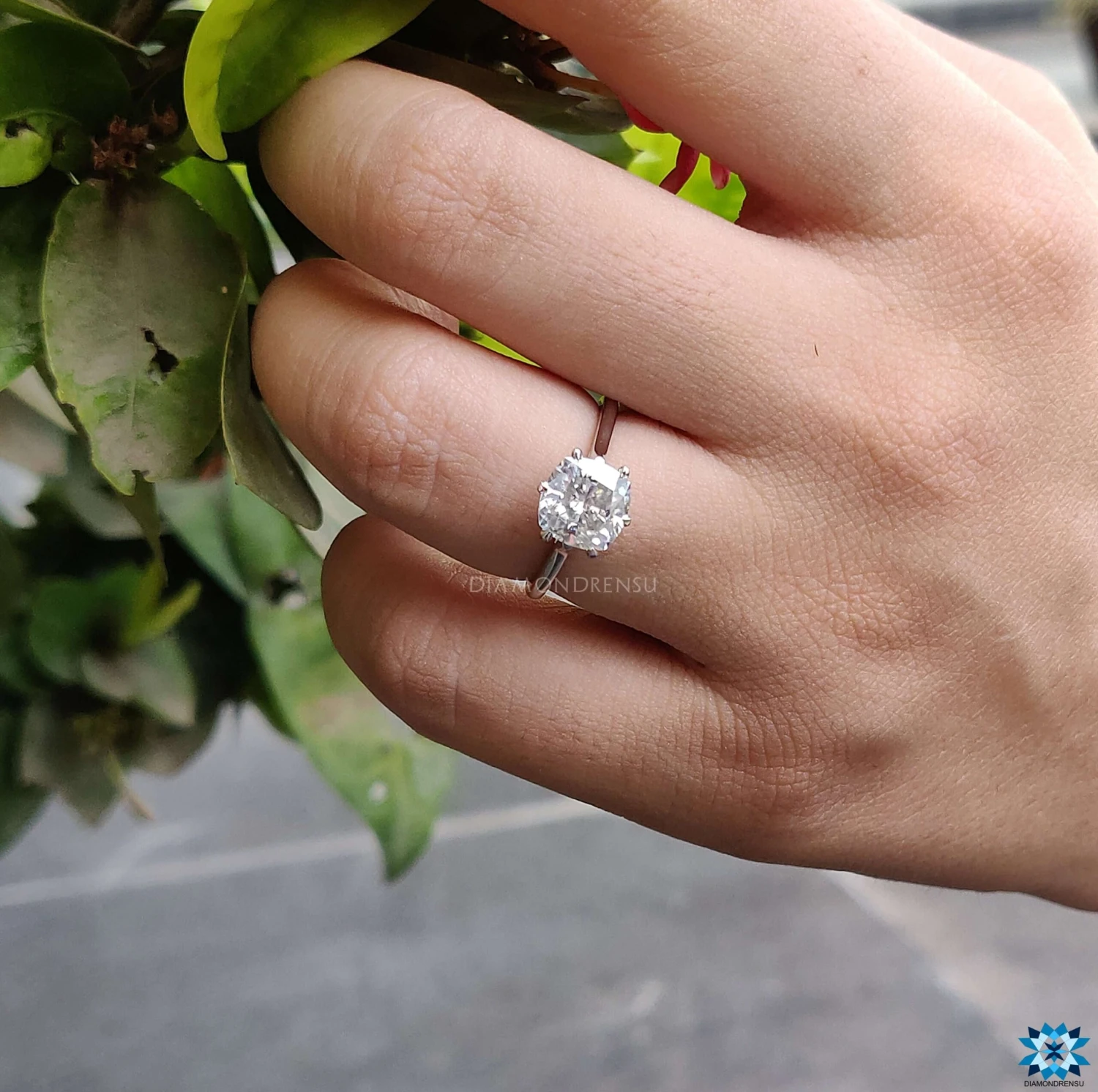 This solitaire moissanite engagement ring features a cushion shape colorless moissanite diamond. Four prongs hold the center cushion cut beautifully. The thick shank of precious metal gives a comfortable look to everyone finger who wears this solitaire beauty.