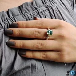 This affordable moissanite engagement ring features a cyan blue cushion divine moissanite beautifully held in four prongs. Additionally, pave set of tiny round cut stones placed on the shank gives extra sparkle. Moreover, this ring also comes with a basket setting. The basket setting is the best setting in which the center stone is perfectly held. The listed design will also be made with any center stone of your choice with any metal tone.