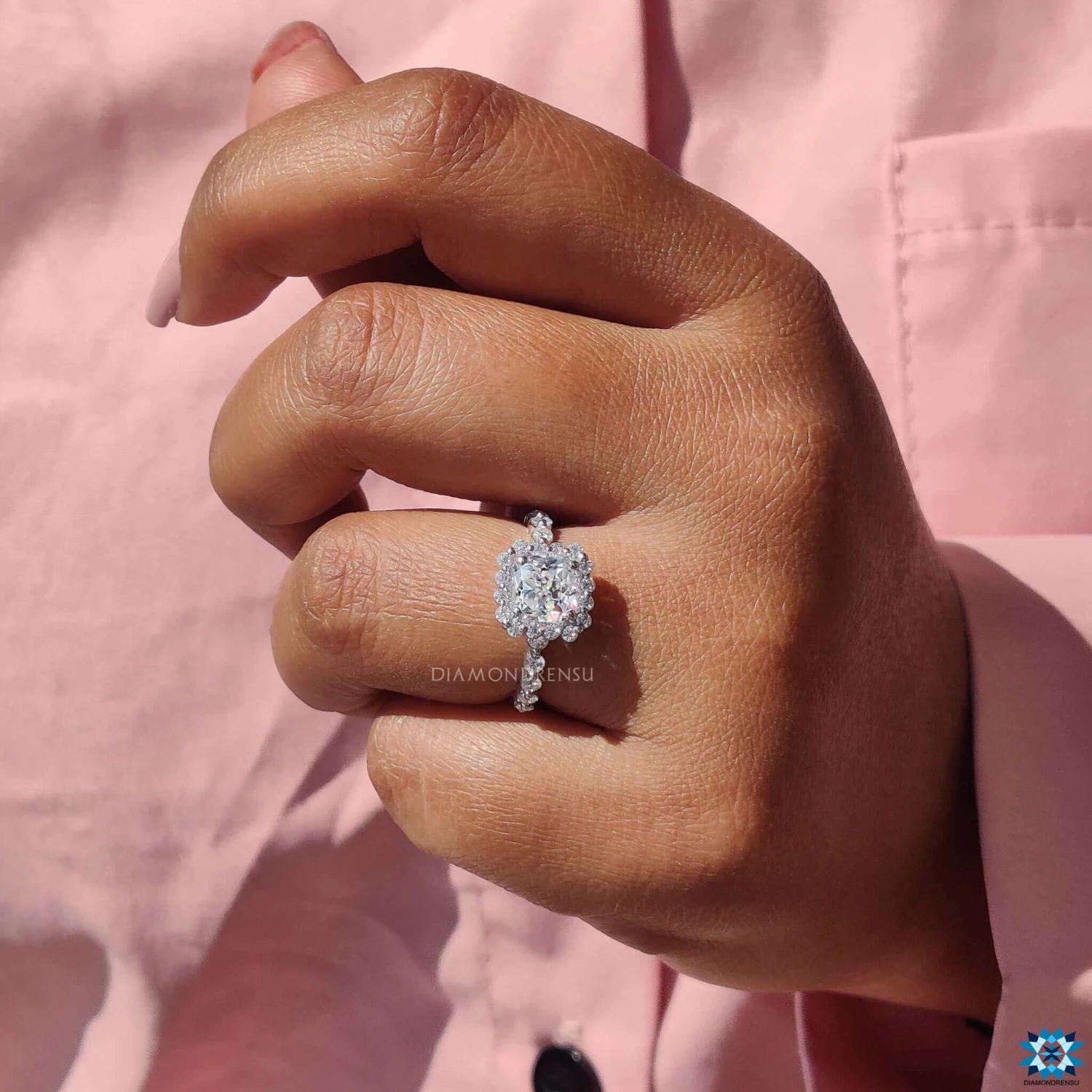 This cushion rensu cut moissanite halo engagement ring is a perfect combination of traditional and modern design. This floating bubble halo engagement ring features a floating bubble pave shank, which will make it stand out in any setting. The floating bubble halo engagement ring is an elegant and romantic choice for an anniversary gift.