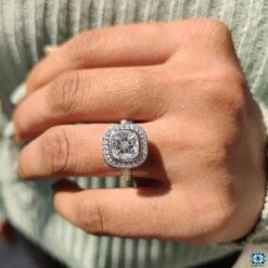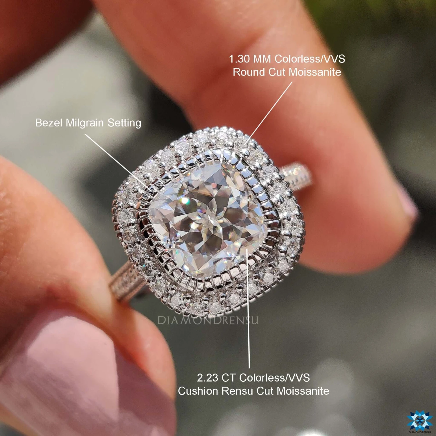 This cushion rensu cut moissanite halo engagement ring is a perfect combination of traditional and modern design. This floating bubble halo engagement ring features a floating bubble pave shank, which will make it stand out in any setting. The floating bubble halo engagement ring is an elegant and romantic choice for an anniversary gift.