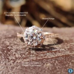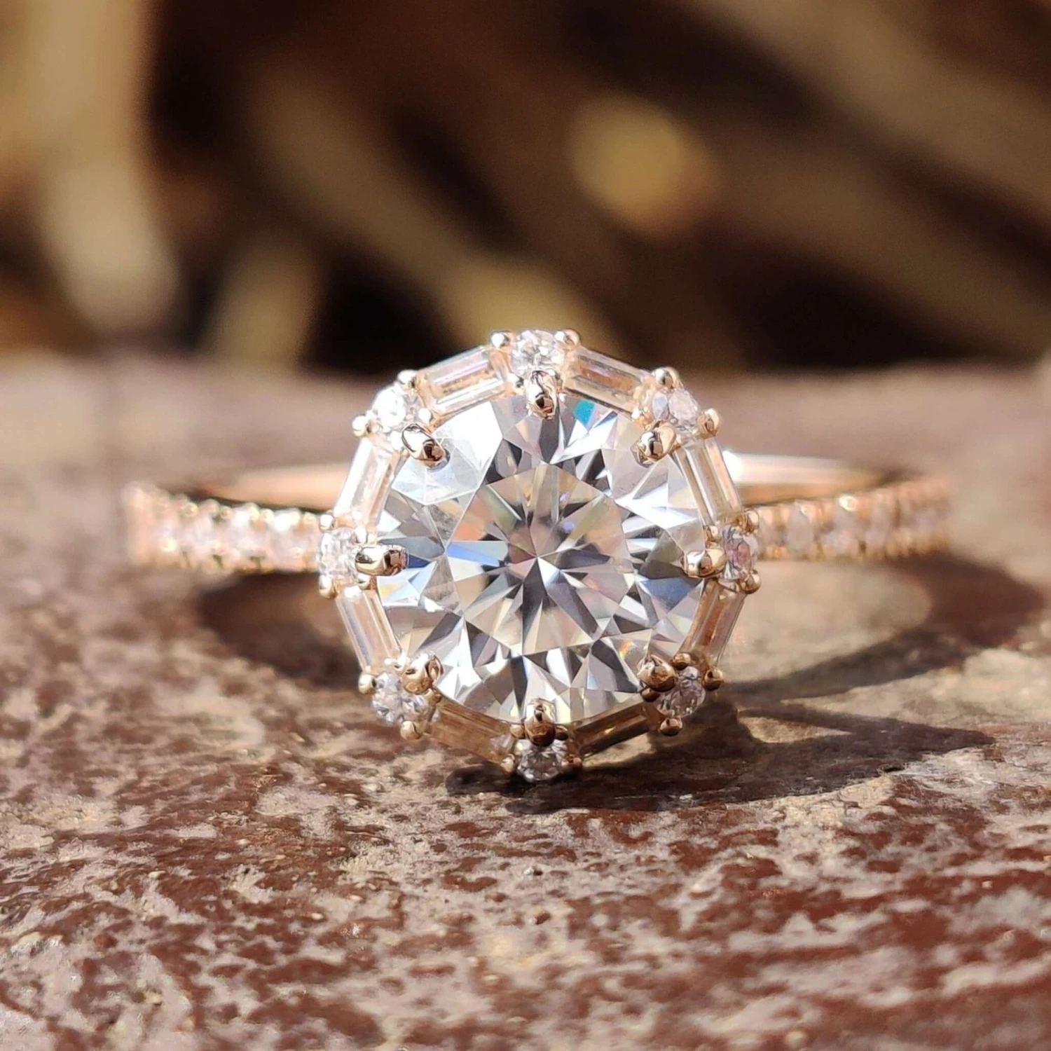 Completely gorgeous look, Inspired her with this vintage style moissanite engagement ring that features a center round cut moissanite which is safely covered by a unique halo setting of baguette round cut which is set alternatively to add some delicate look to the ring, Wrap pave of tiny round cut moissanite also looks pretty with this amazing ring
