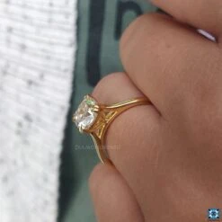 This moissanite solitaire ring kindly features a center shine of cushion divine moissanite which is perfectly captured by double claw prongs. In addition, this listed design also includes a cathedral set of precious metals. The cathedral setting provides superior light reflection for the center stone and also makes the center stone bigger. The cathedral setting is much and more secure than other ring style settings, which protect the stone from impact damage.