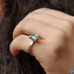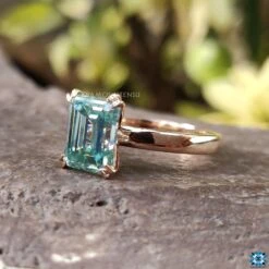 This emerald cut moissanite engagement ring comes with double claw prongs features two slim prongs close together. The center cyan blue emerald step cut set with claw prongs basket setting on thin rounded shank of rose gold. If you are looking for a timeless yet simple solitaire engagement ring, then this is the setting for you.