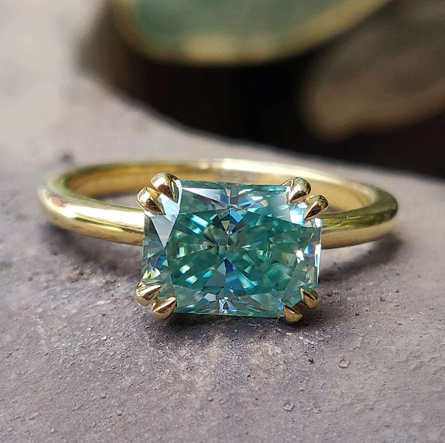 The listed simple solitaire engagement ring includes cyan blue radiant cut set in double claw prongs setting. In additionally this ring provides an east-to-west set. The east-to-west engagement ring is one kind of setting where the stone is oriented horizontally in the shank. Furthermore, the listed moissanite engagement ring design comes with a simple comfort-fit band which adds a comfortness to the ring.