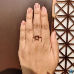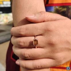 This moissanite solitaire engagement ring features the sparkling champagne emerald step cut moissanite stone which adds a unique look to this listed solitaire engagement ring. The center stone looks more beautiful with a precious rose gold metal tone. Double claw prongs perfectly hold the emerald cut moissanite stone. Create your custom engagement ring with your custom specifications.