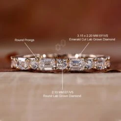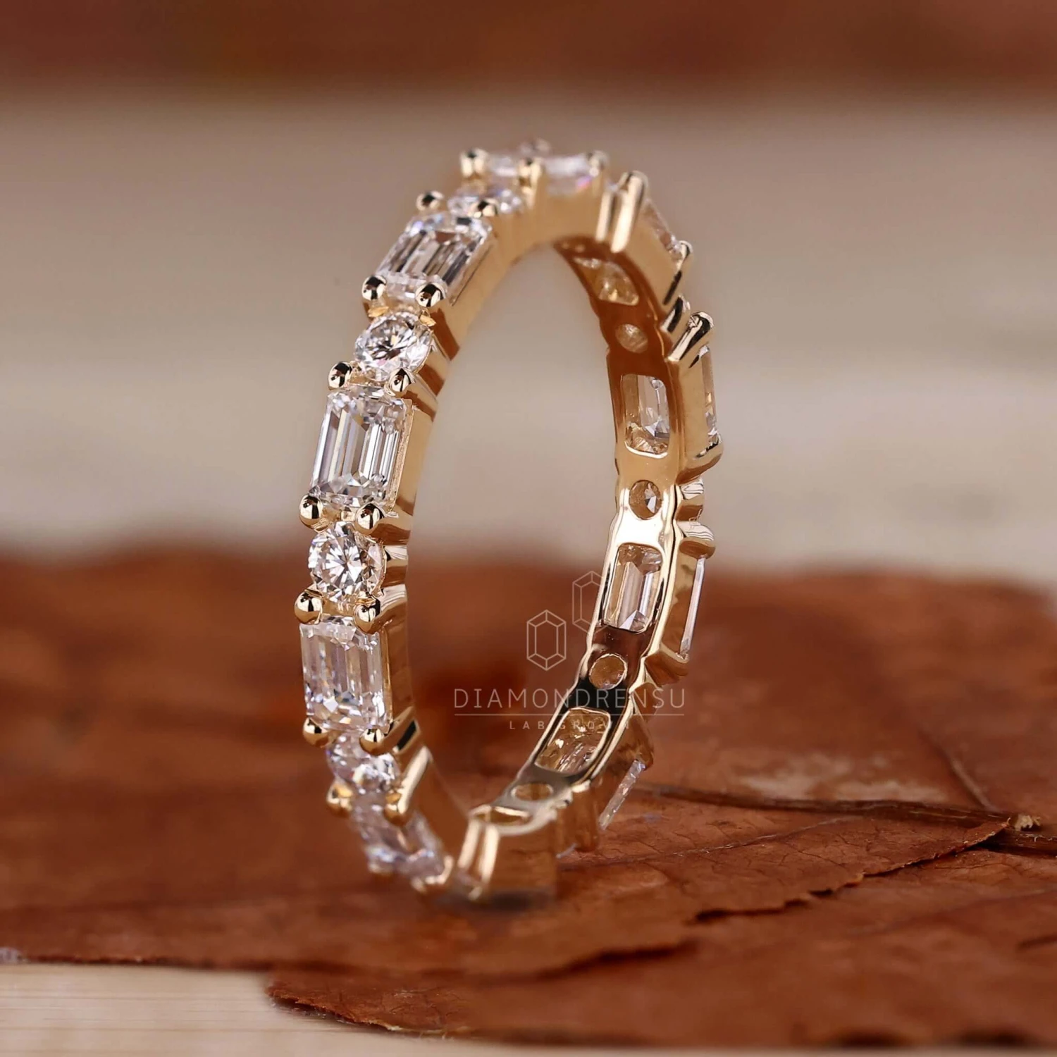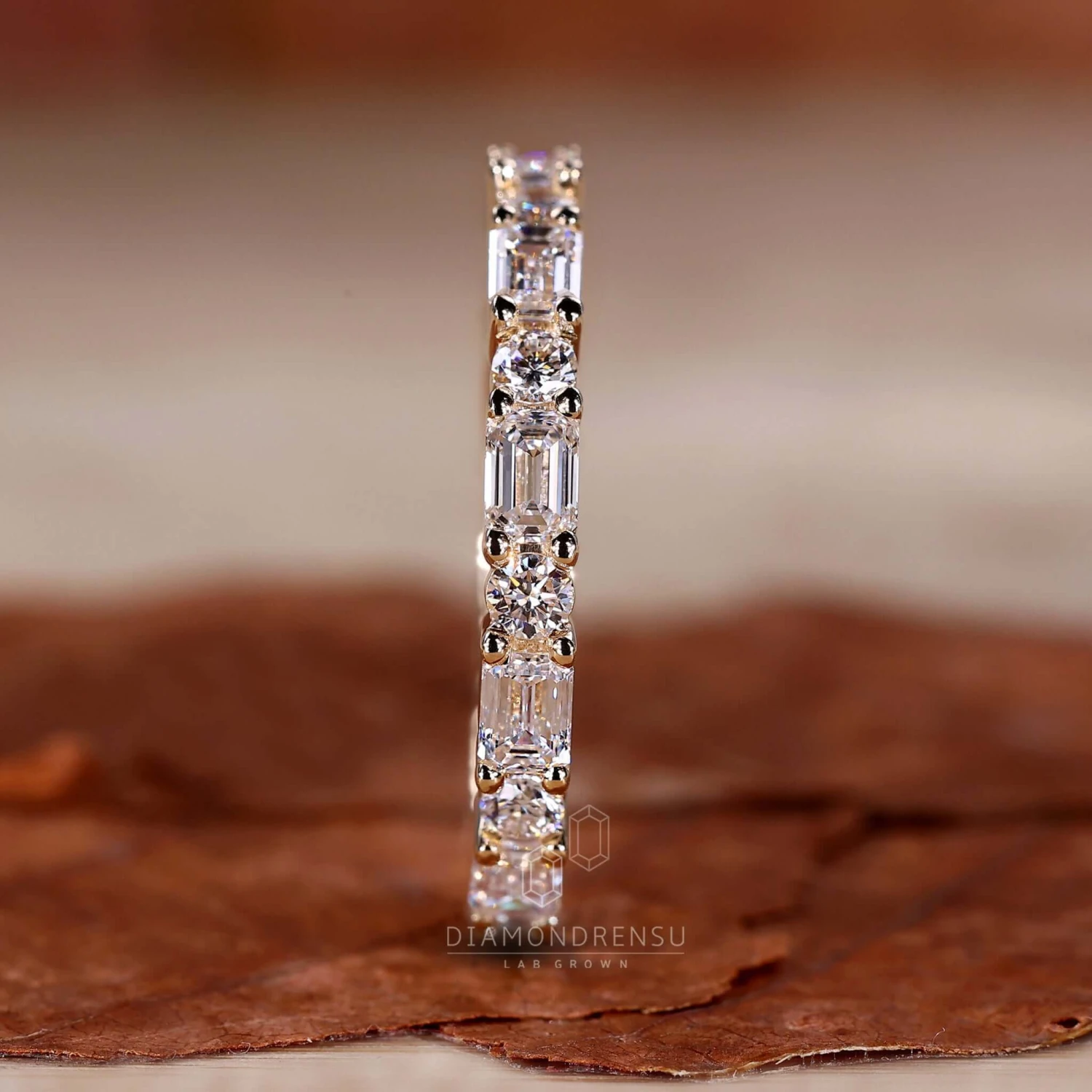 This listed lab grown diamond eternity band comes with the sparkling beauty of emerald and round cut. Moreover, in this design, both round and emerald cut stones are set alternatively to enhance the beauty of the ring. Apart from this, this ring can stack with any of your engagement rings and you can make a unique bridal set for yourself by wearing an engagement ring with this band.