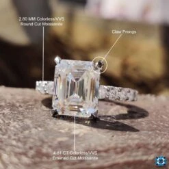 Emerald cut moissanite ring is the desirable choice because its large surface area makes it appear larger and bigger than other moissanite shapes with same carat weight.