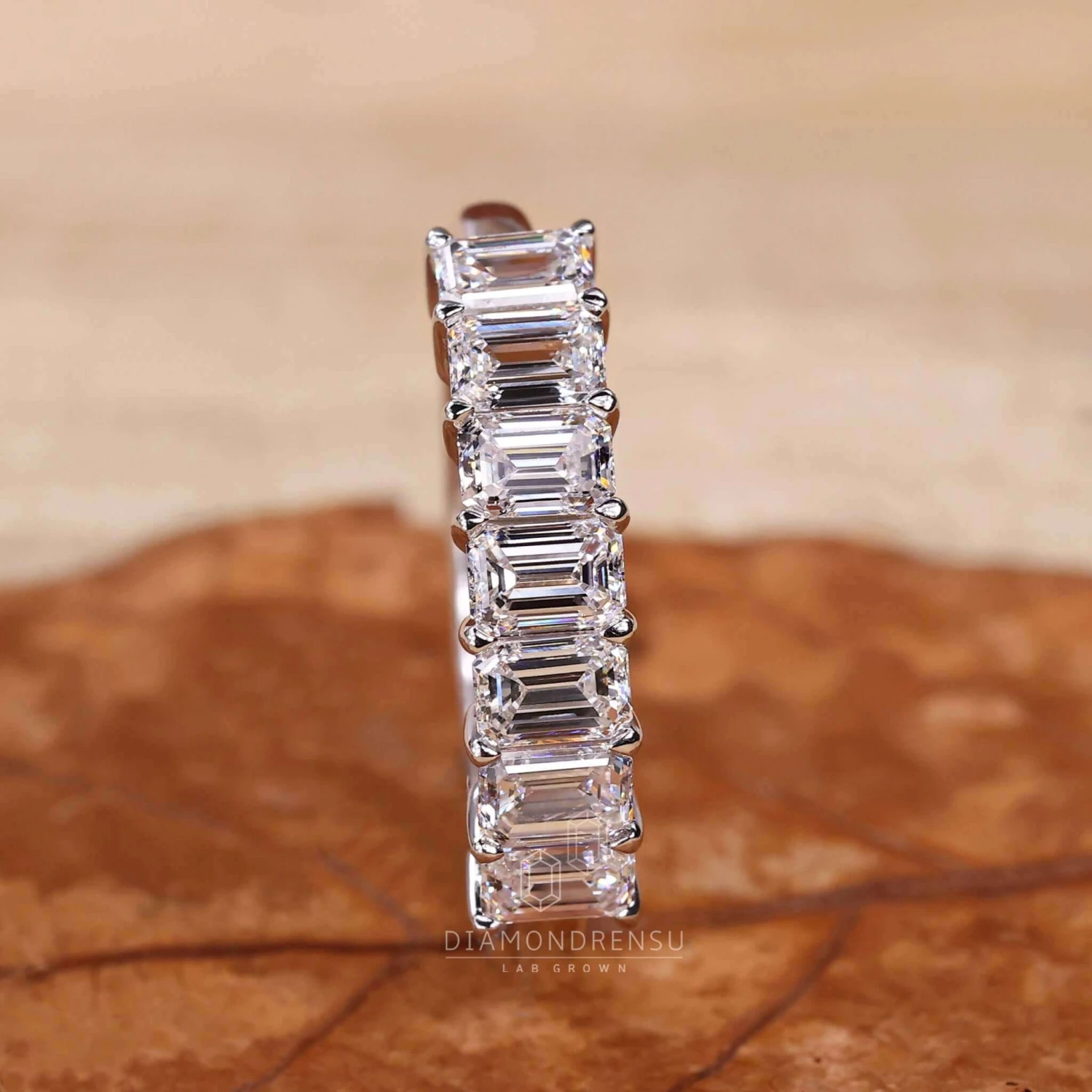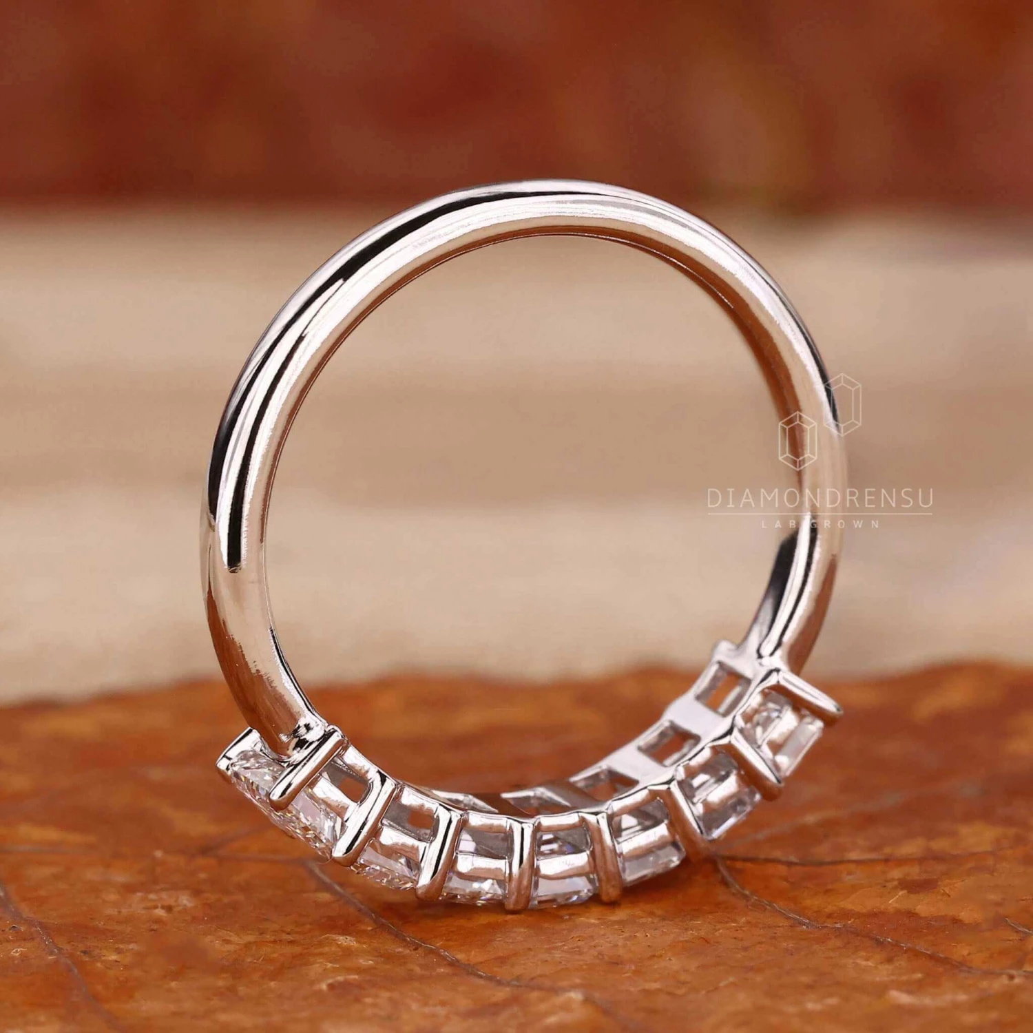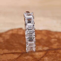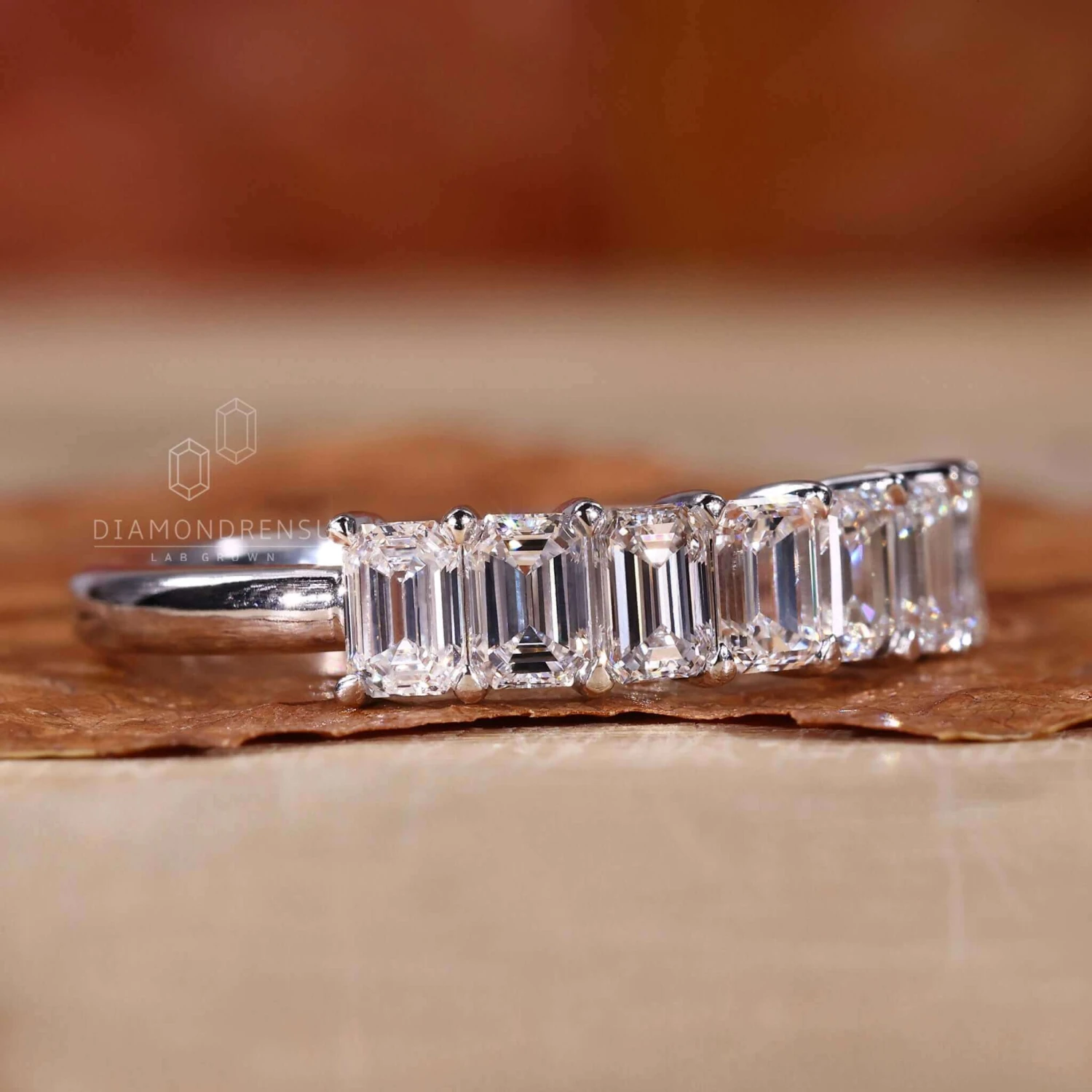 Introducing our stunning half eternity emerald cut diamond wedding band, the perfect addition to any wedding set or stackable ring collection. Crafted with precision and beauty, this ring will make a lasting impression on any admirer.