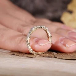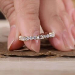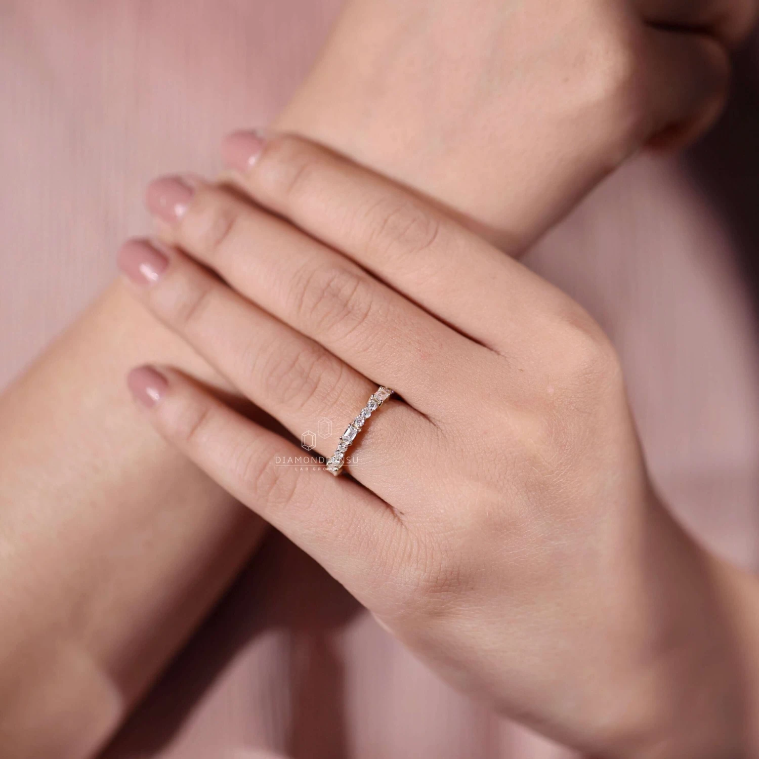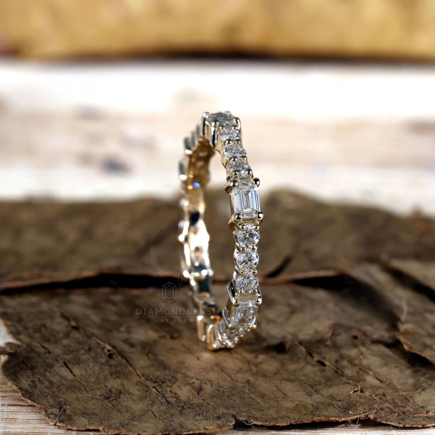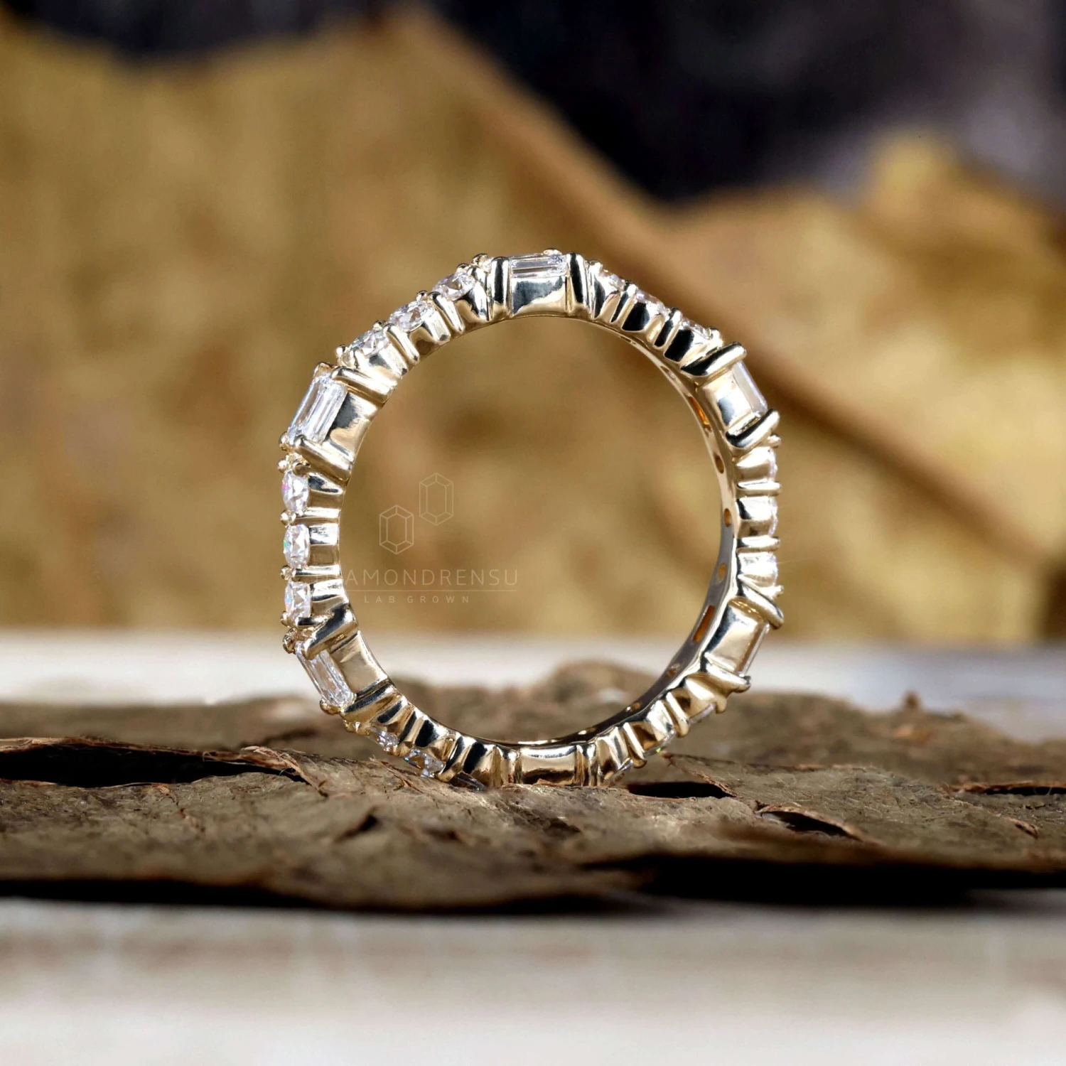 This listed lab grown diamond eternity band includes alternatively minimal emerald and round cut diamond set. This dazzling lab grown diamond wedding band adds a unique shine to your event. Give it something new turn by wearing this eyecatching beauty of emerald and round cut lab created diamonds.
