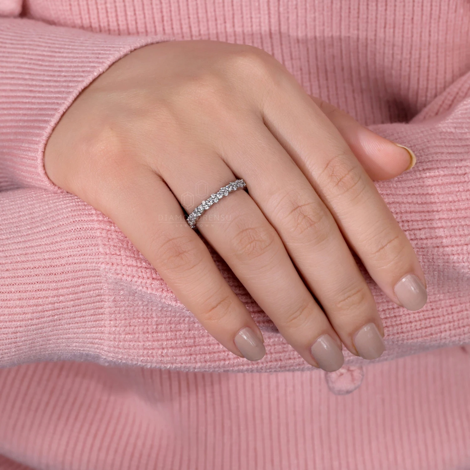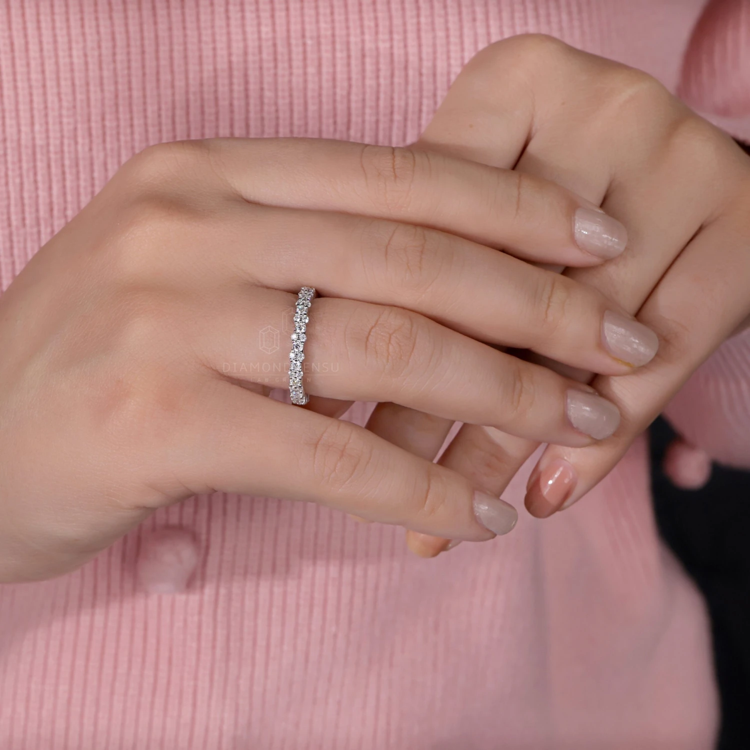 This lab diamond wedding band comes with the sparkling beauty of a round brilliant cut diamond wrapped around the shank. In addition, this band includes a beautiful floating bubble prong-set, that perfectly catches every stone. This floating bubble setting adds a classic look to the ring. The beautiful diamond eternity wedding bands are a popular choice for all collections, functions, and daily wear also. Wear this beauty and make your event memorable for you.