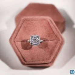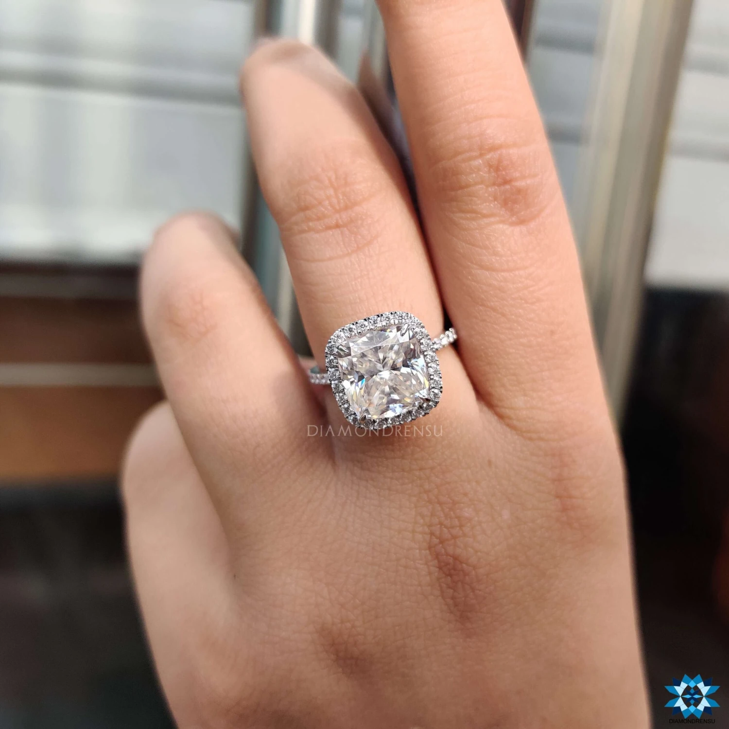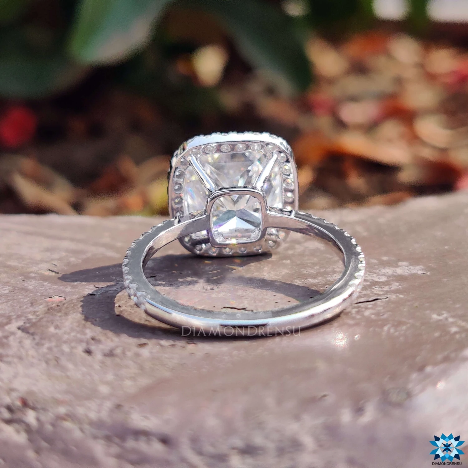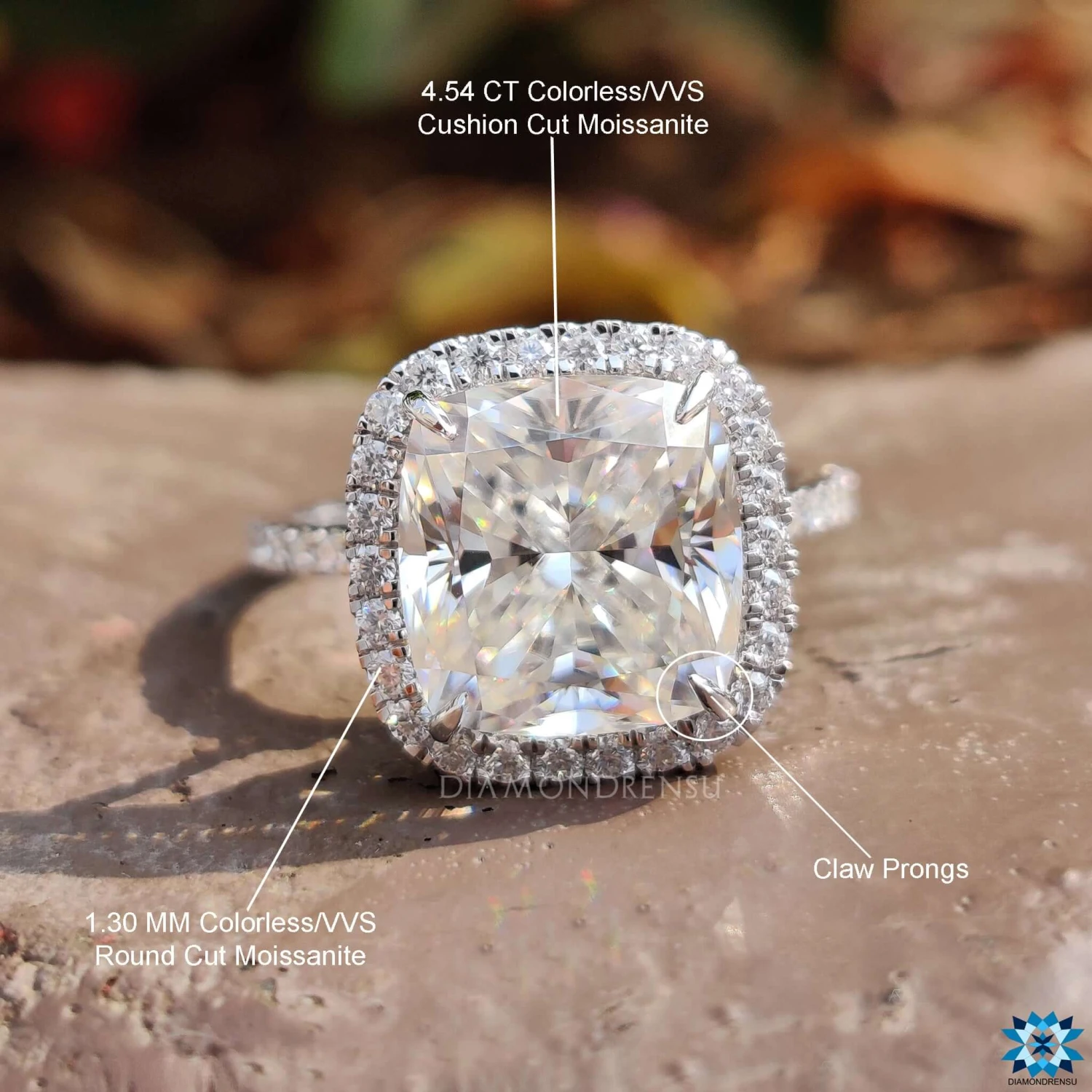Moissanite halo engagement ring is the first choice for a gift for her. The beautiful halo setting highlights the center cushion moissanite.