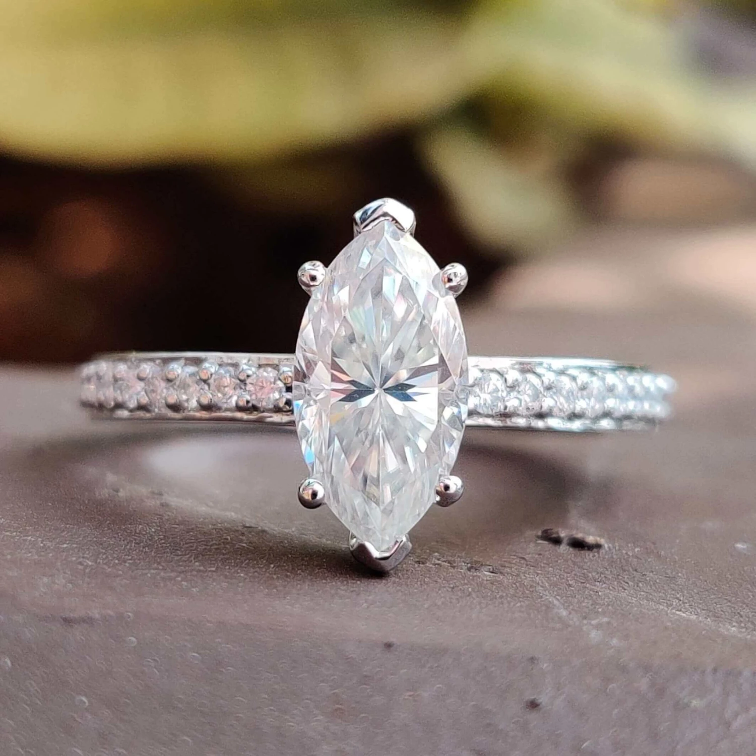 This affordable moissanite engagement ring comes with a center marquise cut perfectly captured in four prongs with a basket setting. Two corners of the marquise cut and give modern look to the listed moissanite. Tiny round cut stones surround the center stone and perfectly wrap half of way of the shank and add an extra charm to the ring.Â
