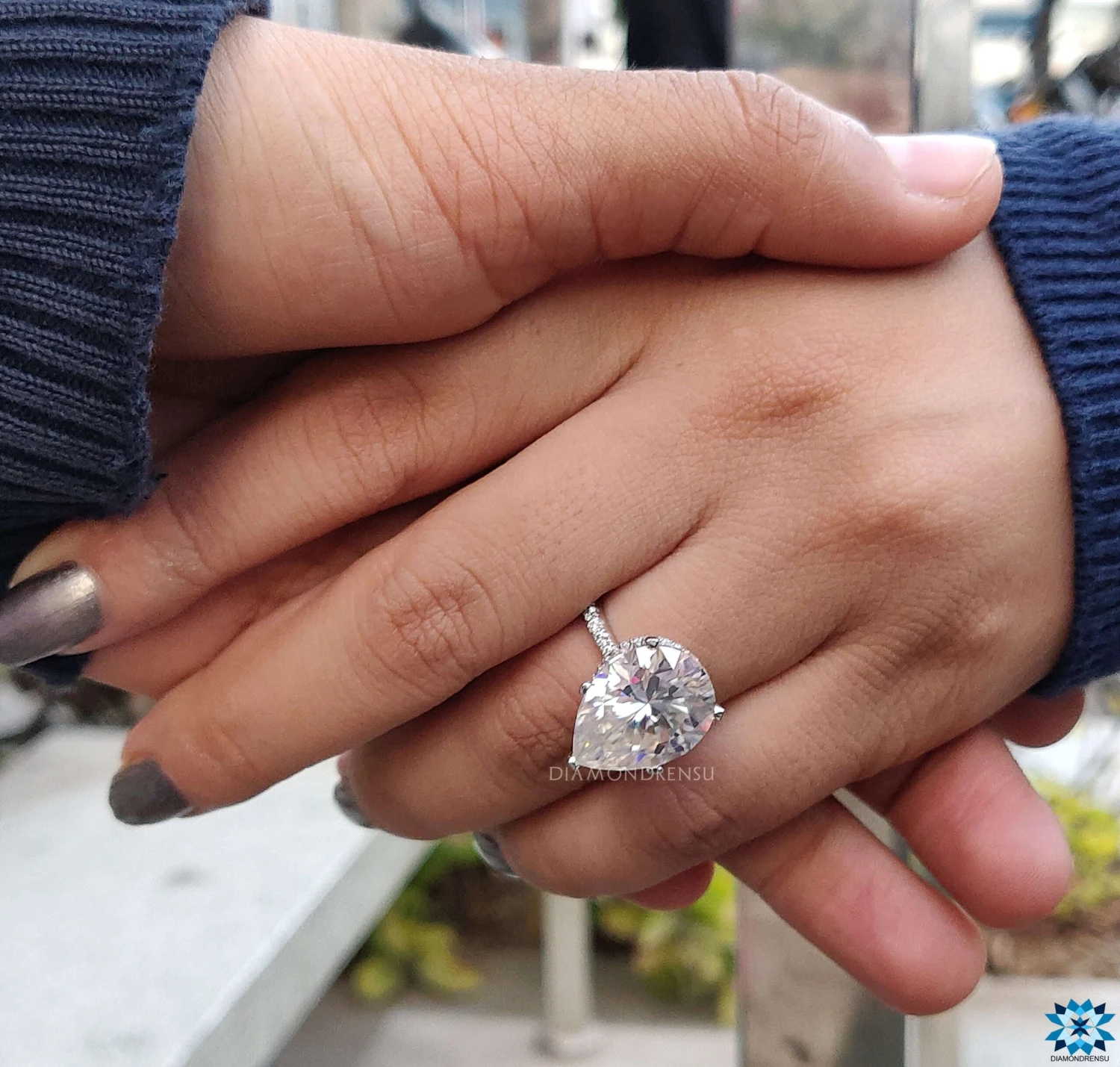 With Diamondrensu products, you also get to choose from a variety of personalization options. Starting with the kind of metal used to forget the ring, customers can choose between silver and gold, but between the gold of different purity levels. You can also choose the visual color of the metal. There are three choices available- rose, gold, and white. To make the delicately designed moissanite pear-shaped engagement ring even more unique, we also offer a free engraving service. You can get any name, or short message of your choice etched on the ring.