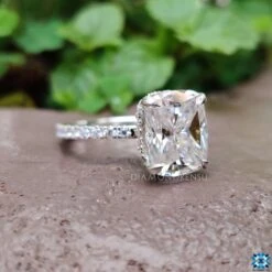 This beautiful hidden halo engagement ring comes with a center colorless cushion captured in simple claw prongs. The shimmering colorless round cut surrounds the center elongated cushion cut, which adds a hidden shine to the listed engagement ring. In addition, a tiny round cut wraps half of the shank and gives extra charms to this moissanite diamond engagement ring. This beautiful engagement ring is the perfect and special anniversary gift for her.