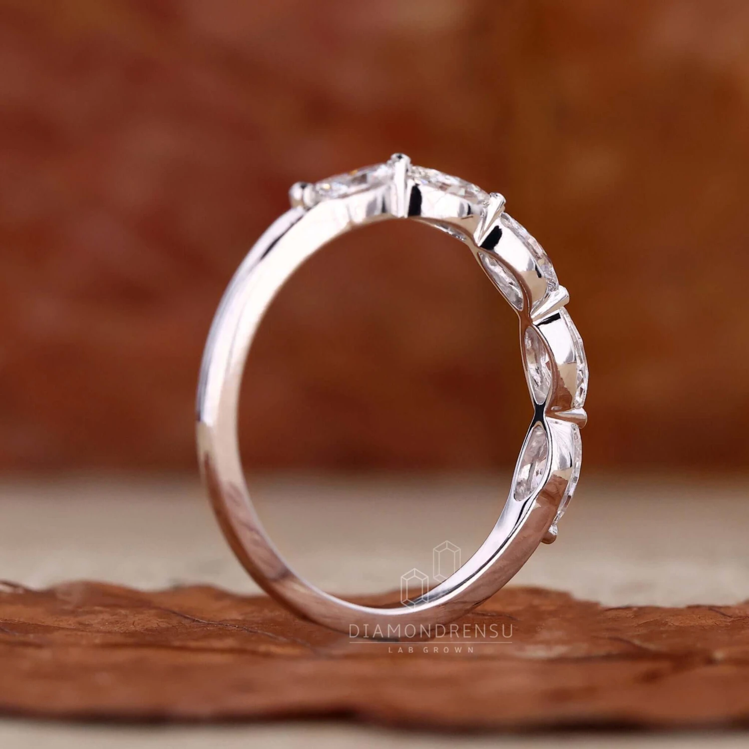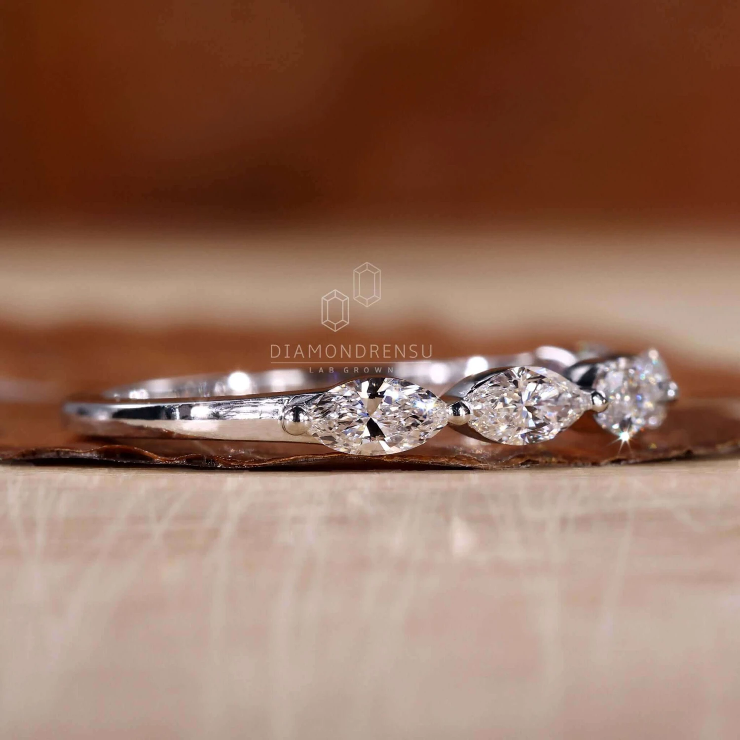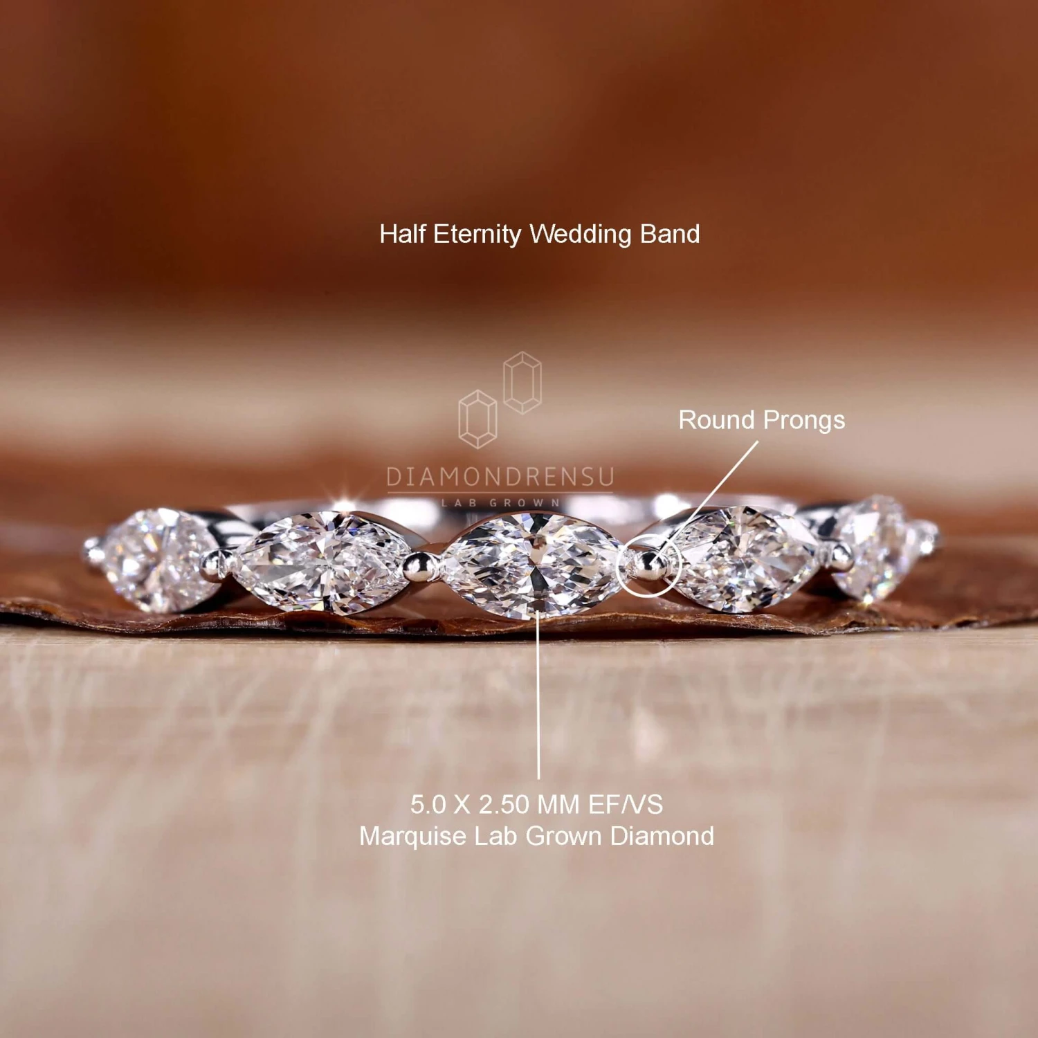 Enhance your wedding set with the Marquise Cut Lab Grown Diamond Half Eternity Wedding Band for Women. Featuring an east to west set marquise lab-created diamond, this matching and stackable band by Diamondrensu adds a touch of elegance and sparkle to your special day. With its exquisite design and ethical sourcing, this wedding band symbolizes everlasting love and commitment. Complete your bridal look with this beautiful handcrafted piece.