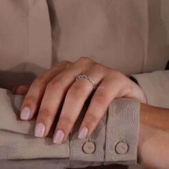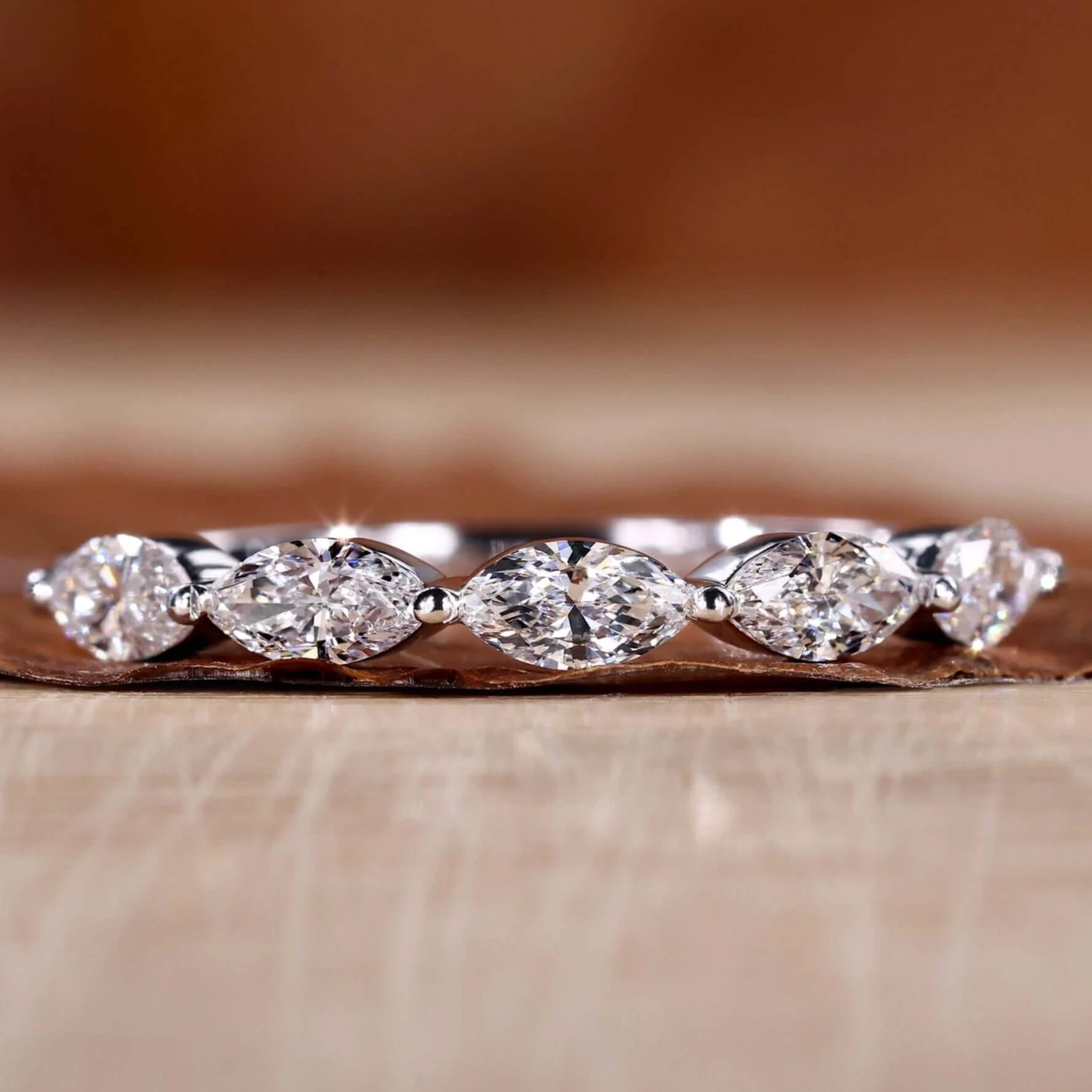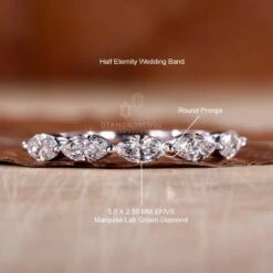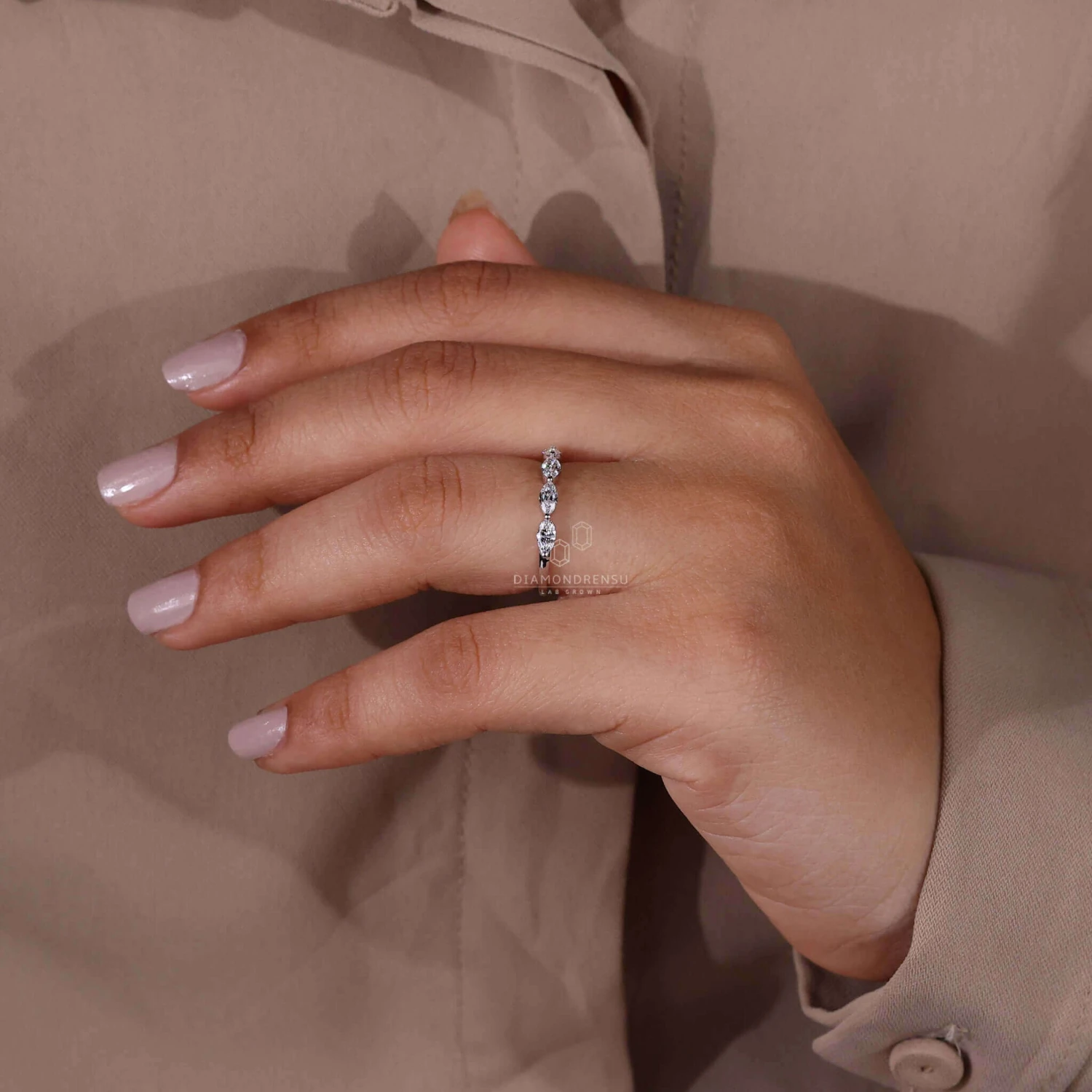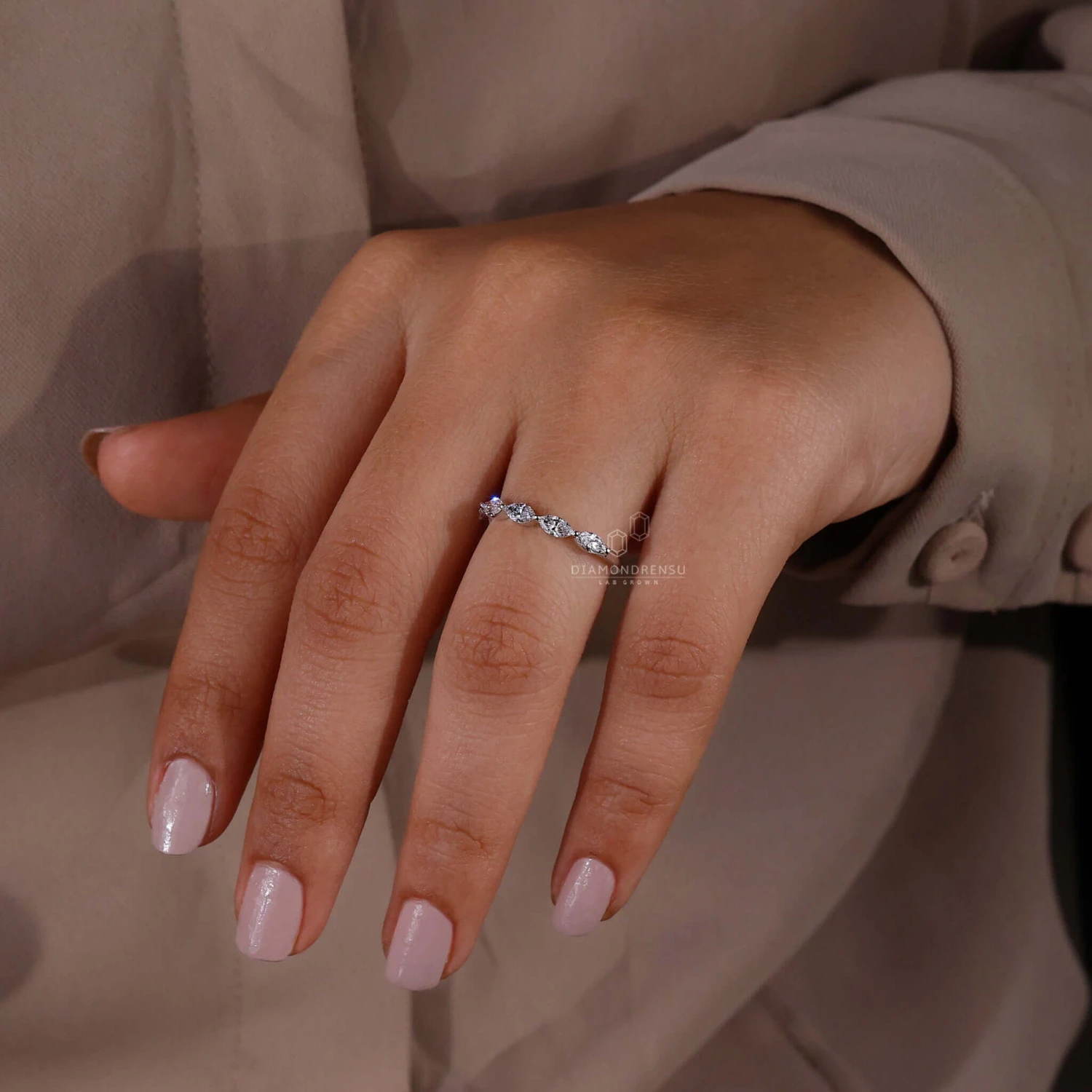 Enhance your wedding set with the Marquise Cut Lab Grown Diamond Half Eternity Wedding Band for Women. Featuring an east to west set marquise lab-created diamond, this matching and stackable band by Diamondrensu adds a touch of elegance and sparkle to your special day. With its exquisite design and ethical sourcing, this wedding band symbolizes everlasting love and commitment. Complete your bridal look with this beautiful handcrafted piece.