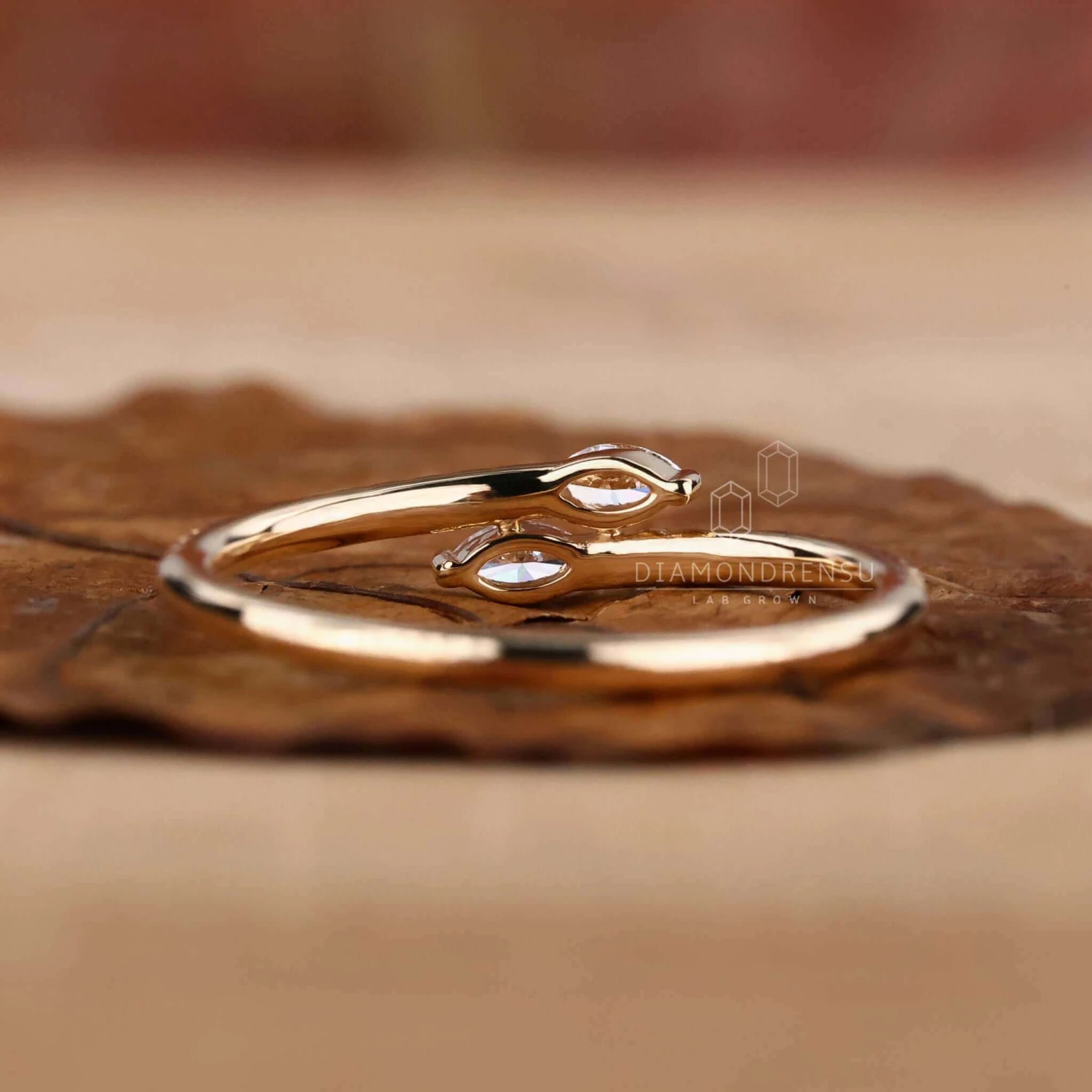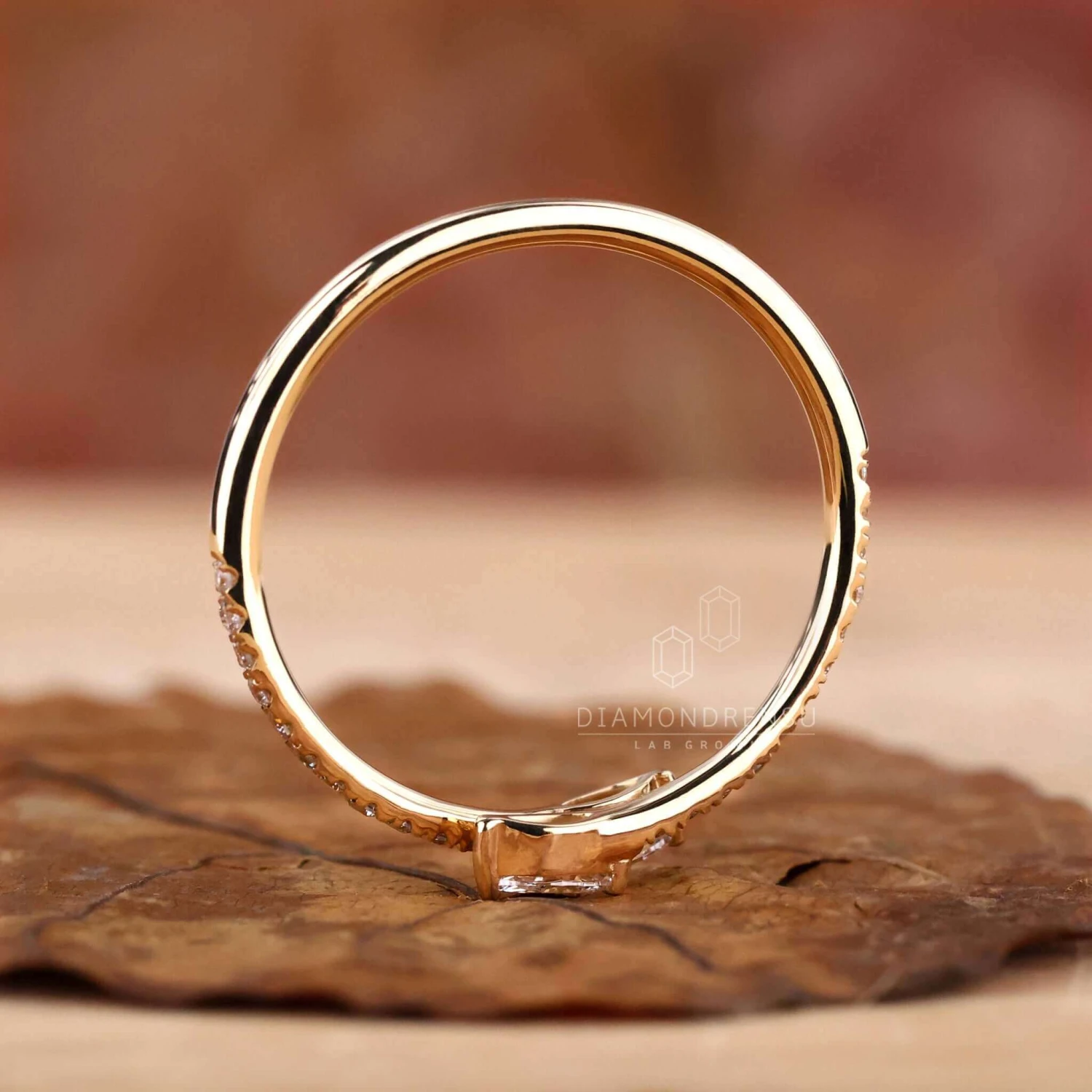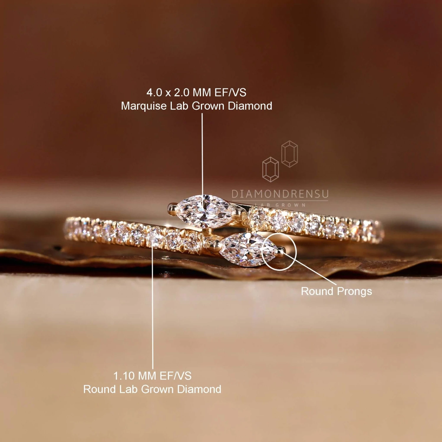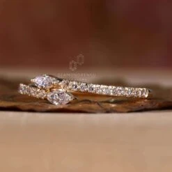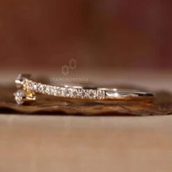 This bypass setting lab grown diamond wedding band features a yellow gold shank divided into two parts. These two different shanks are decorative with mini round cut lab created diamonds. A minimal wedding band includes small marquise cut lab grown diamonds set before the round cut lab diamonds. This unique and dazzling lab grown diamond wedding band will look gorgeous with vintage and pave style lab grown engagement ring.