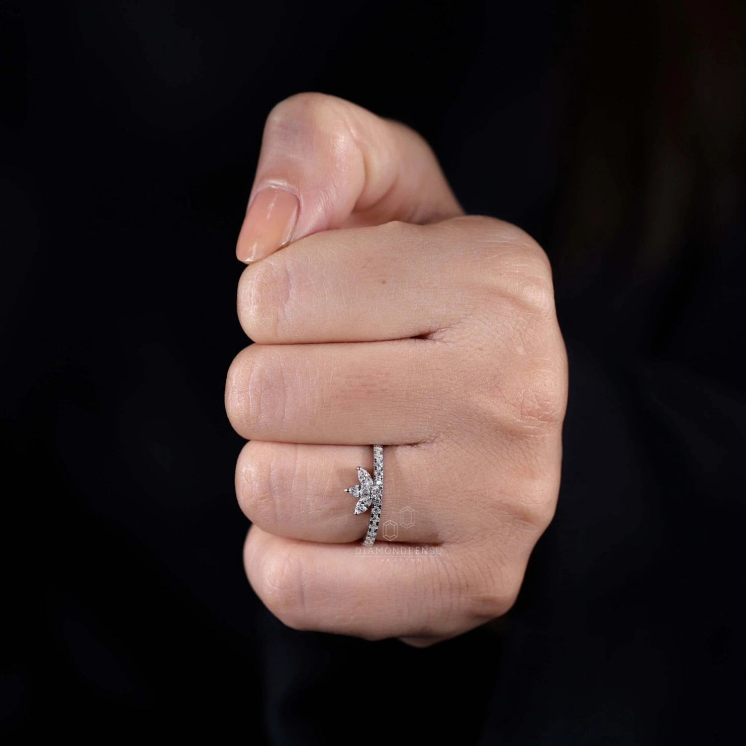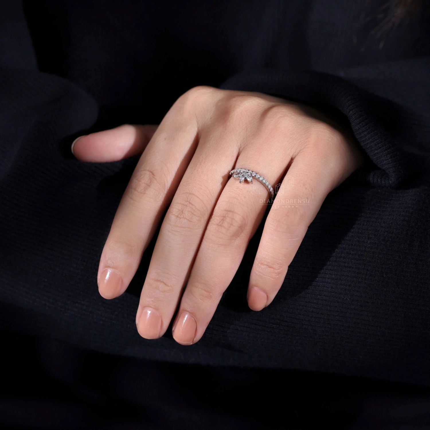 This listed lab grown diamond wedding band includes three marquise cut stones which are set as a leaf or flower in the simple eternity shank. Sparkling half eternity wedding band adds a unique shine to the band with the sparkling beauty of minimal round brilliant cut lab grown diamonds. Stack this lab grown diamond wedding ring with any of your other engagement rings and make the perfect wedding ring set.