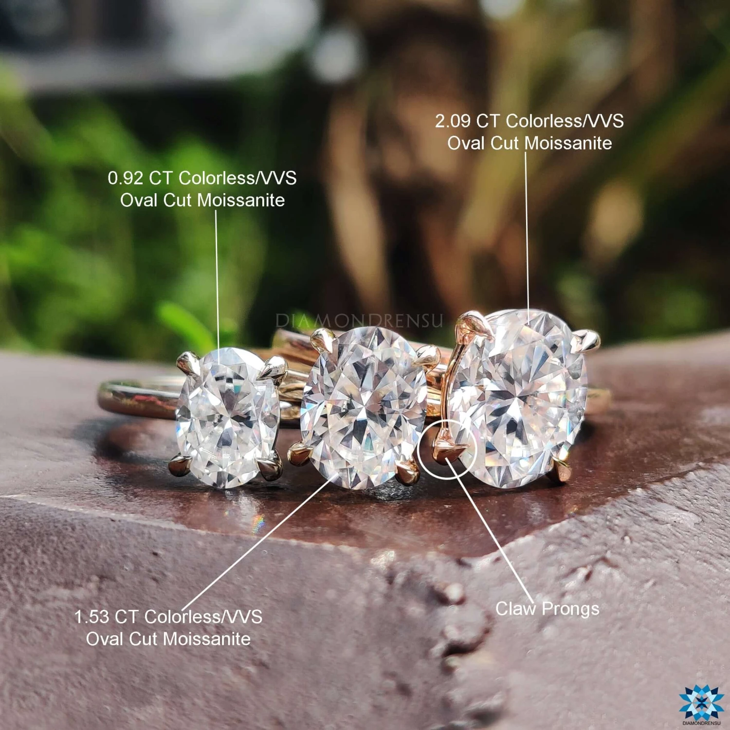 Oval-shaped moissanite offers the classic elegance touch to the engagement ring. An oval engagement ring is a subtle way to show off your unique personality. This handcrafted engagement ring showcases oval moissanite in a four-prong solitaire setting with a rounded shank.
