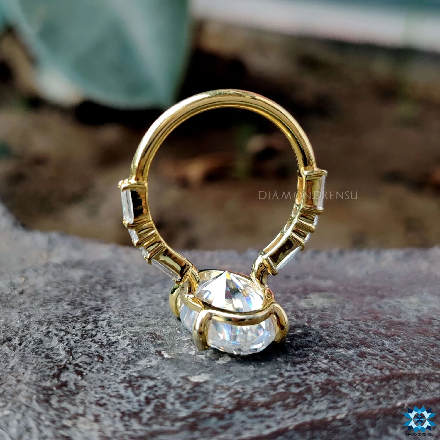 This dazzling open gallery pave set moissanite engagement ring features unique pave set of round and baguette-cut moissanite which flanks extra shine to reach the center unique oval cut moissanite