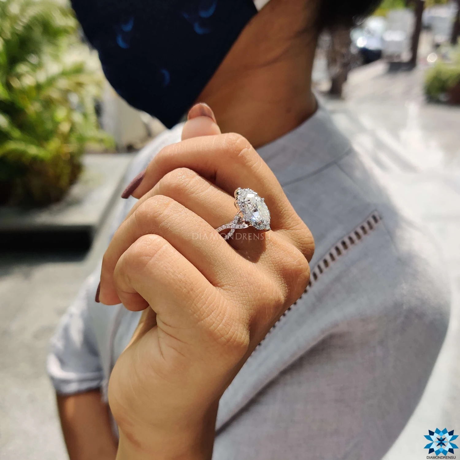 This dashing engagement ring features a graduated diamond halo for a romantic yet dramatic look with a twisted pave shank.