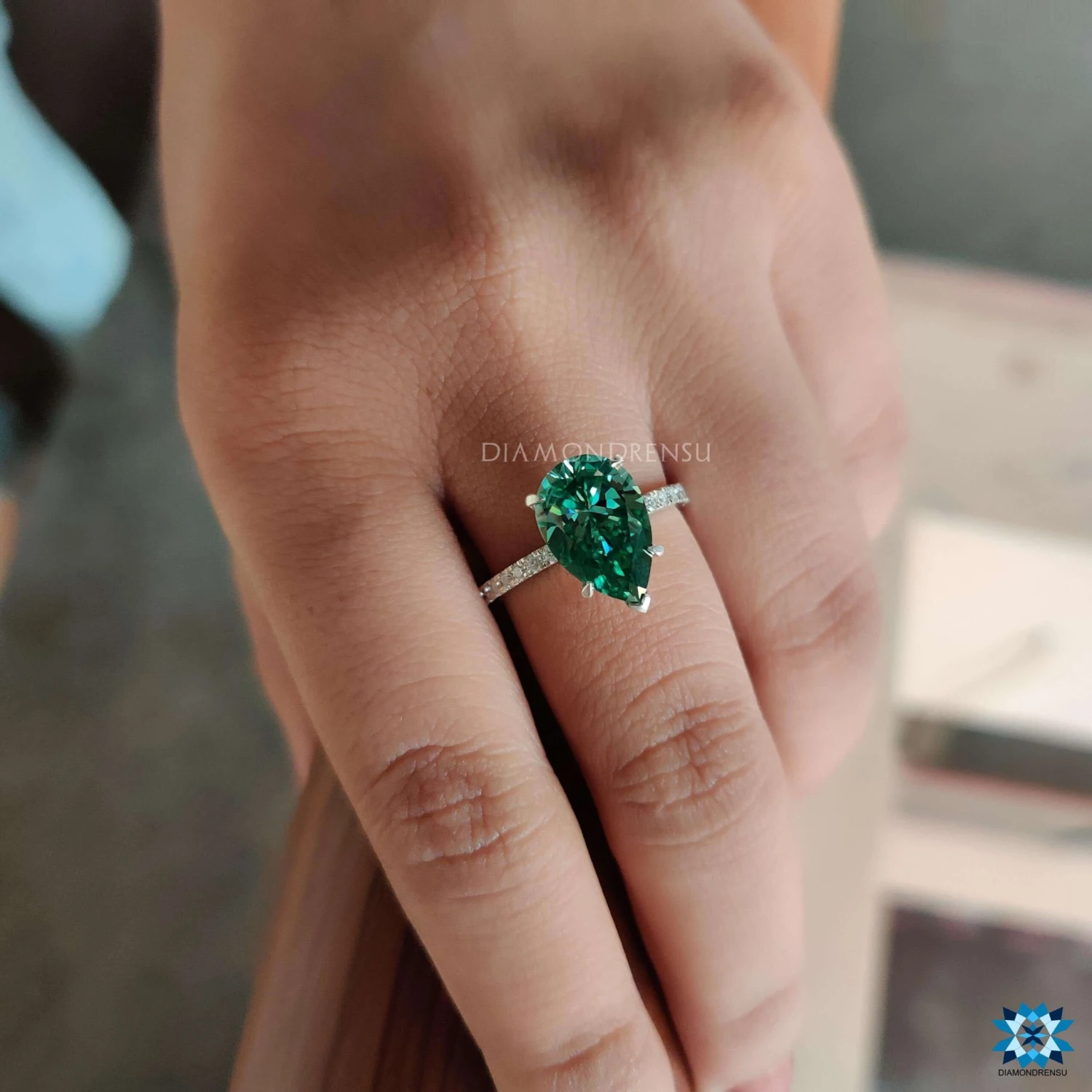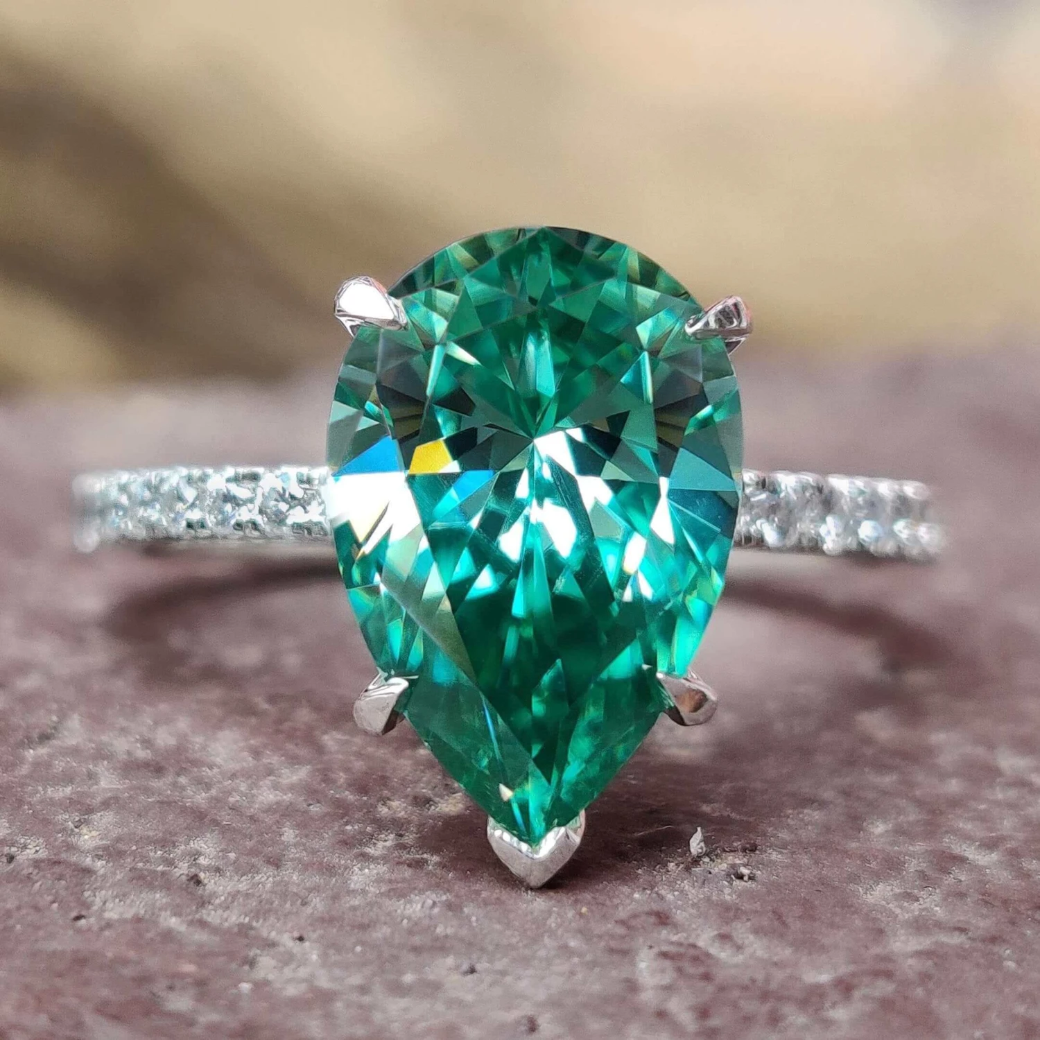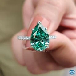 This listed moissanite engagement ring comes with the beauty of sparkling pear cut green moissanite diamond. Five prongs hold the center stone beautifully, and one of them, v prong covers the corner perfectly. The ring looks charming and beautiful because of its center shine of beautiful green moissanite diamond. The green moissanite looks gorgeous with precious white tone metals.