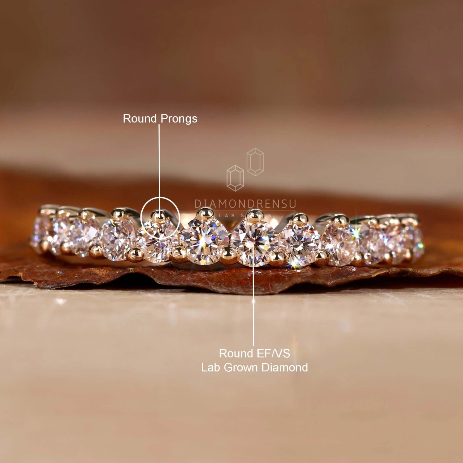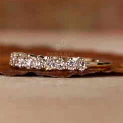 This listed iconic lab grown diamond wedding band comes with the EF/VS round lab grown diamond set with a simple prong setting in precious yellow gold. In addition, this listed iconic lab created diamond band is beautifully matched with simple solitaire and pave engagement ring. Select this listed lab grown diamond band and wear it on your big day.