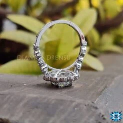 Moissanite halo engagement ring meets the universal connotation of eventual marriage and love. This moissanite engagement ring includes a cathedral setting that gives a supportable look to the center stone and adds a comfortable look to the engagement ring. This engagement ring is the best for those who love shimmering halo beauty with a traditional round stone.