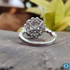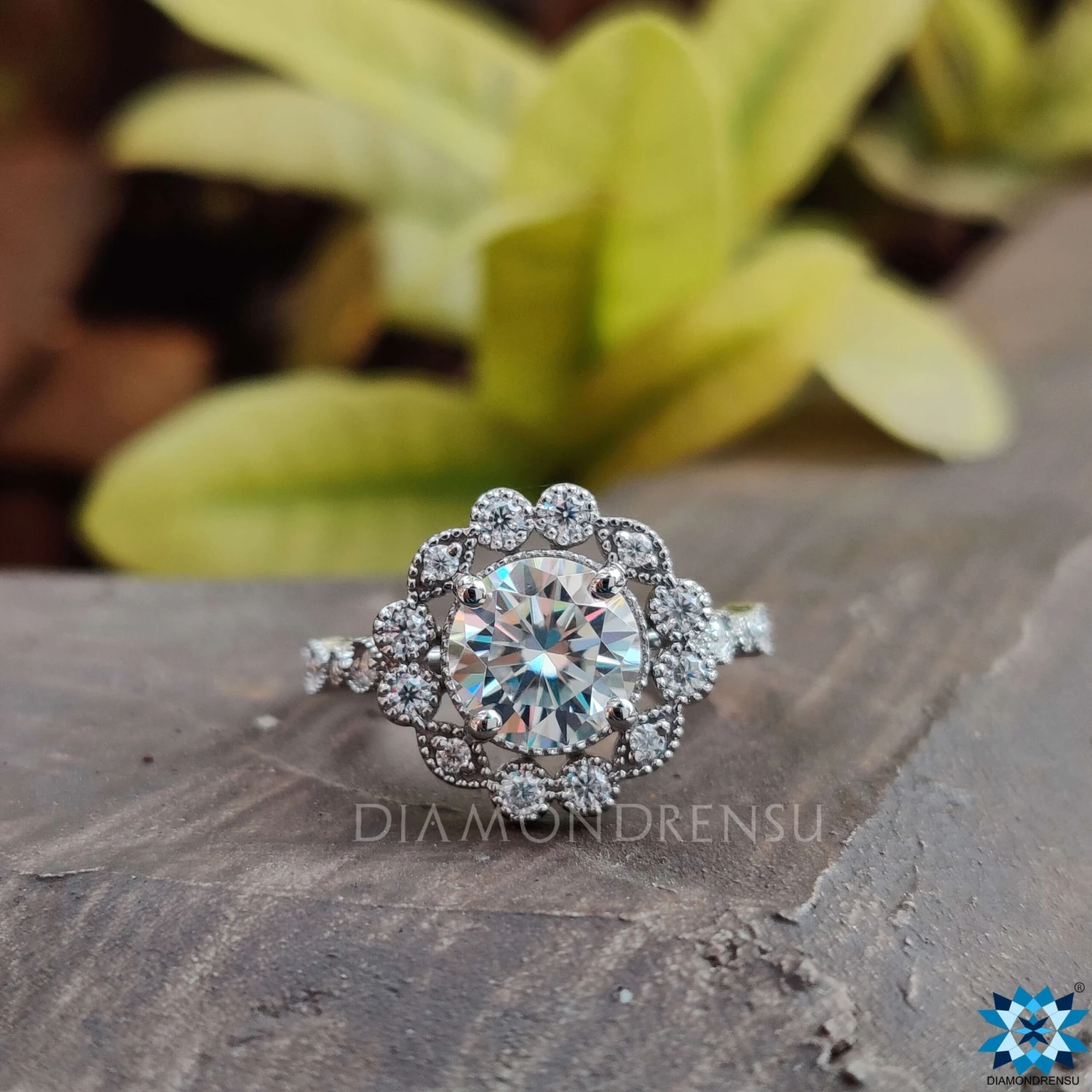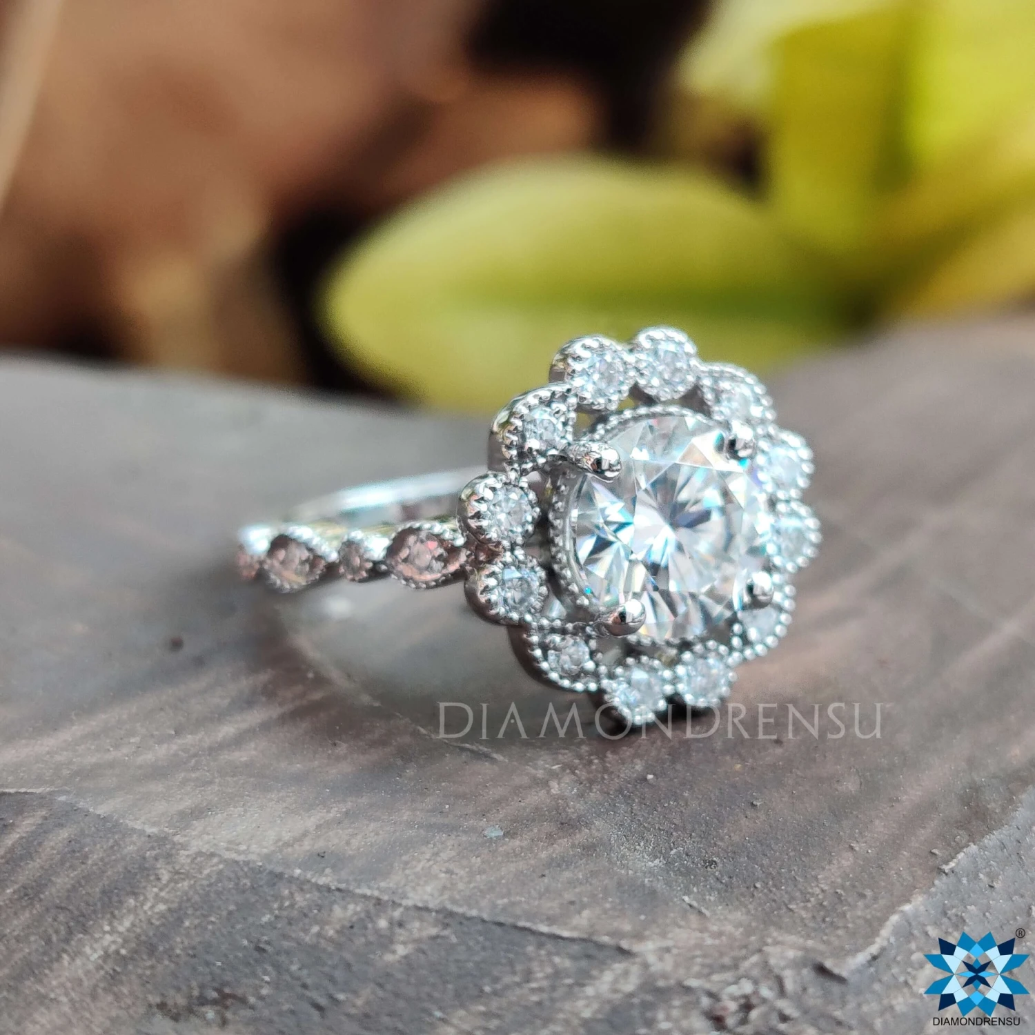 This listed halo engagement ring comes with center colorless round brilliant cut catches by simple four prongs. The beautiful flower style halo setting of shimmering round cut gracefully surrounds the center stone perfectly and makes the center stone larger. Sparkling round cut set in milgrain bezel setting in halo pave set of the listed affordable moissanite engagement ring. Pave set wraps around half of the shank and gives more shine to the ring.