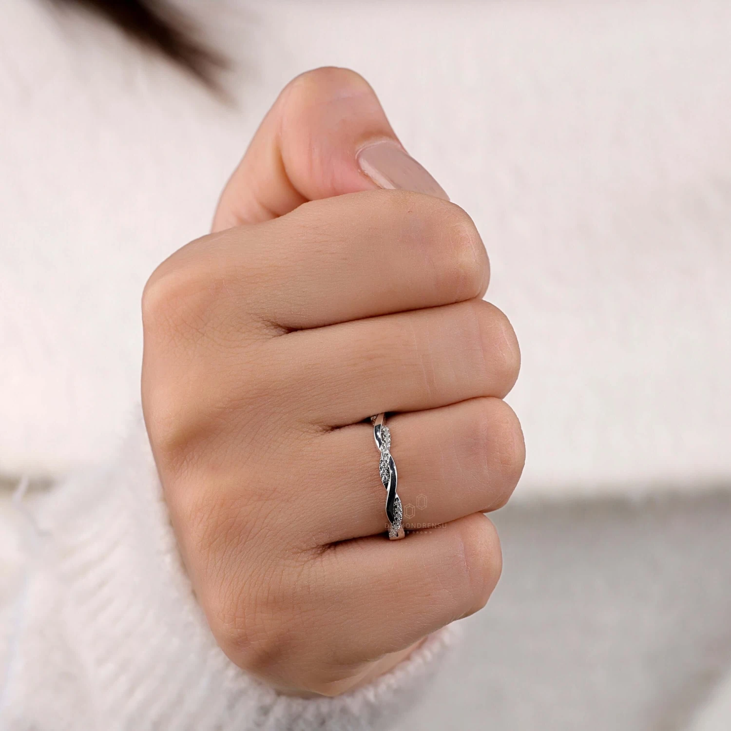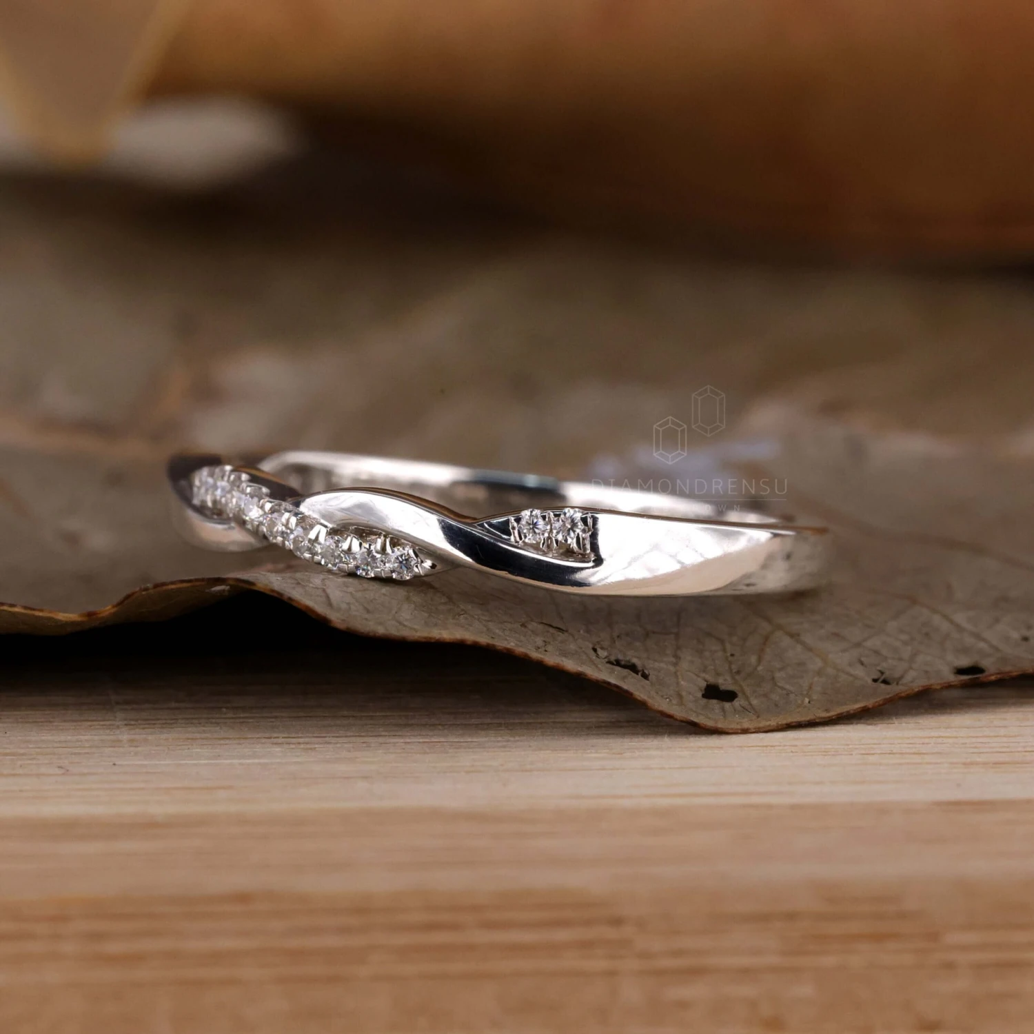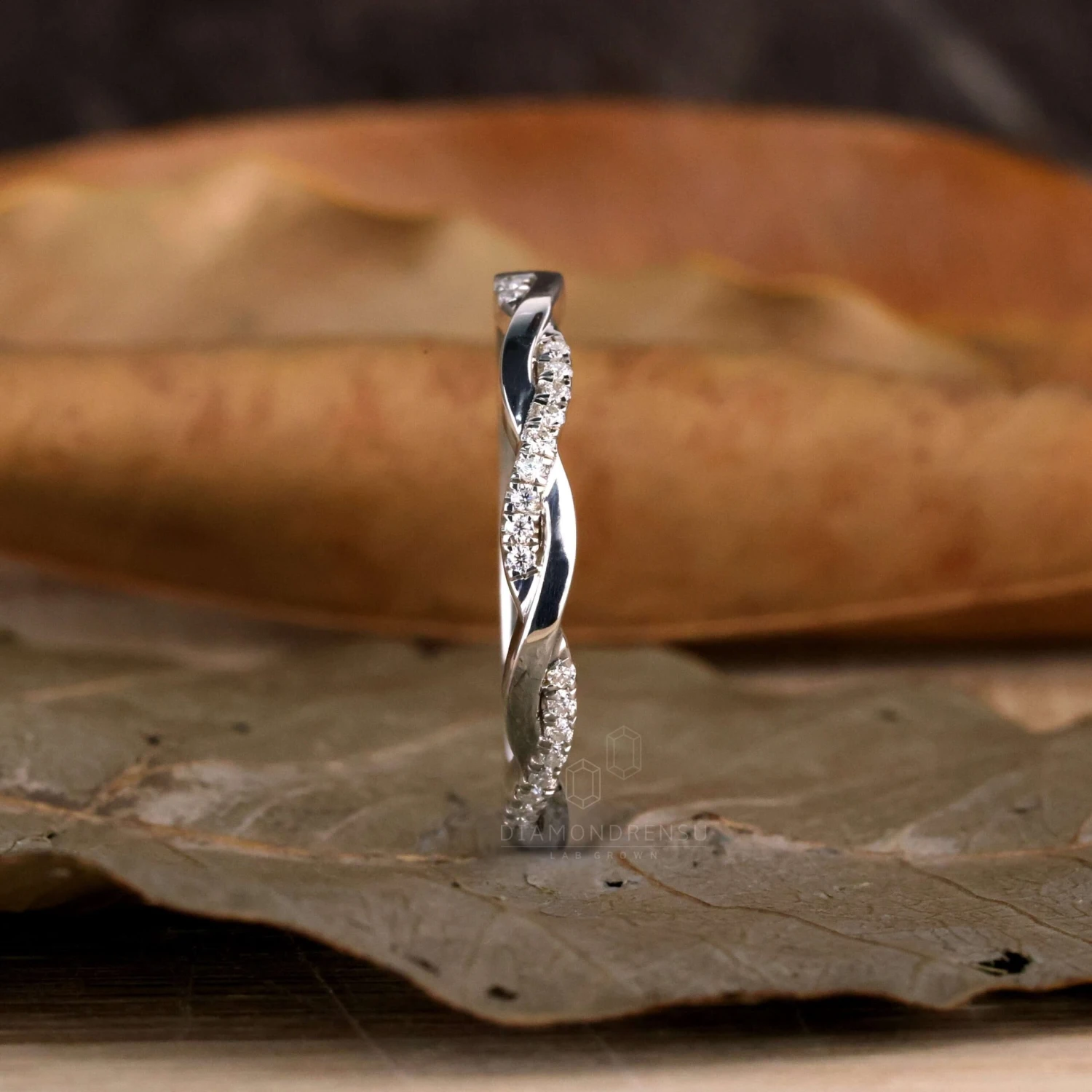 This listed lab grown diamond band comes with the elegant beauty of 1 MM EF/VS round cut lab created diamonds. This twisted wedding band has two bands intertwined together. One is comprised of pave setting and another one is simply metal. This eye-catching look of metal and pave setting band enhances the beauty of your look.