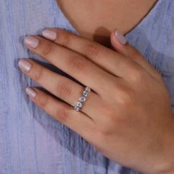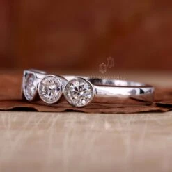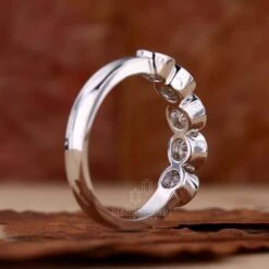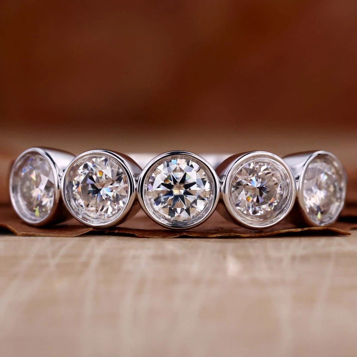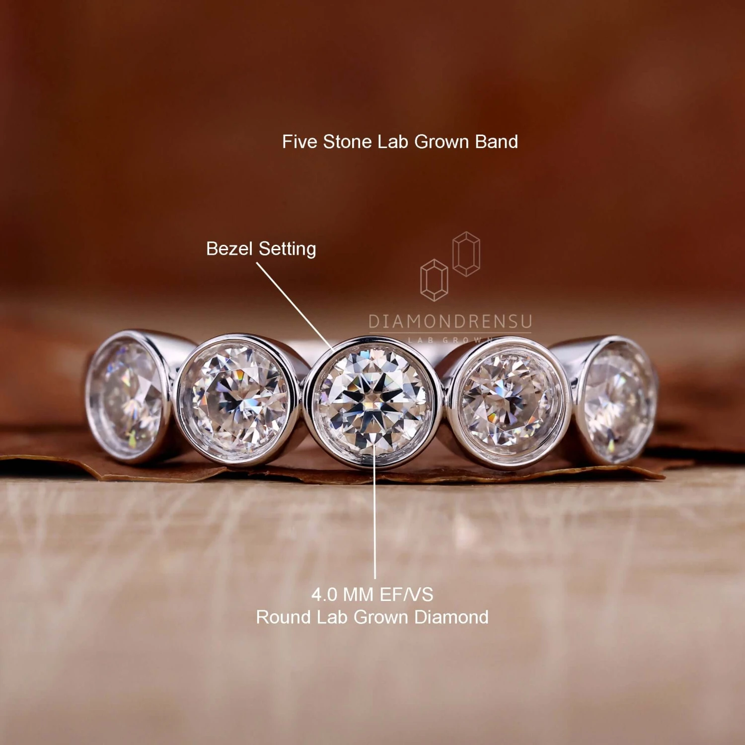 Celebrate your love’s journey with our round lab created diamond five stone wedding band for women. Each diamond is beautifully bezel set, creating a sleek and modern look. This matching stackable band is the perfect complement to your engagement ring. Crafted with care and ethical excellence, Diamondrensu presents a stunning lab grown diamond band that shines with love and style.