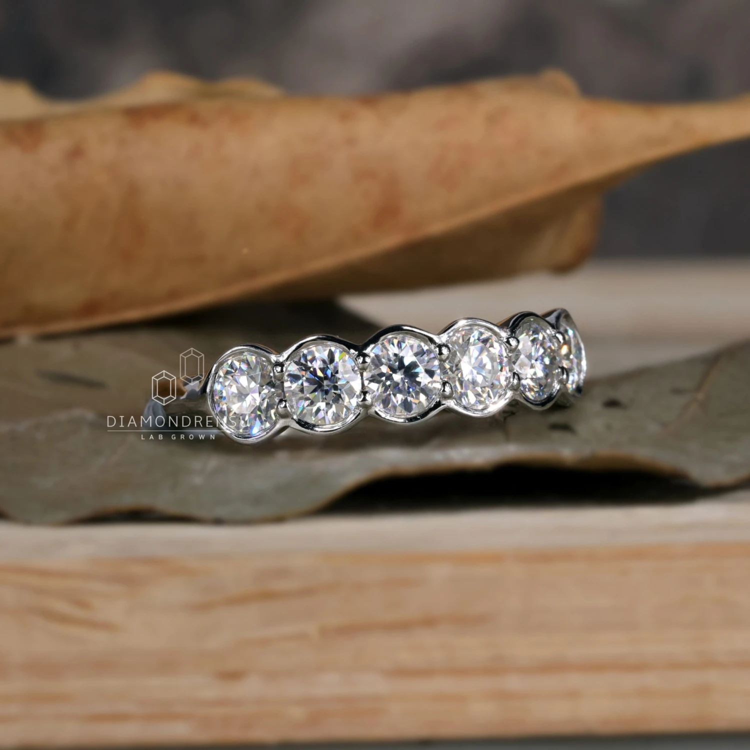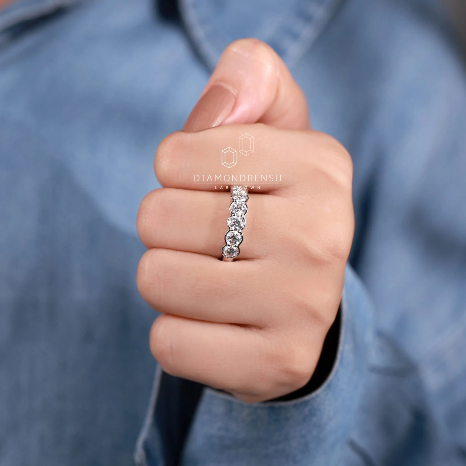 The listed eco-friendly diamond band features 4.0 MM each round lab grown diamond, set in a partial bezel setting. Each stone is set in a thin metal outline of half bezel-set. Lab grown Diamond wedding bands are a popular choice for all occasions, as well as for everyday use. Wear this elegant beauty and makes your moment uncommon.