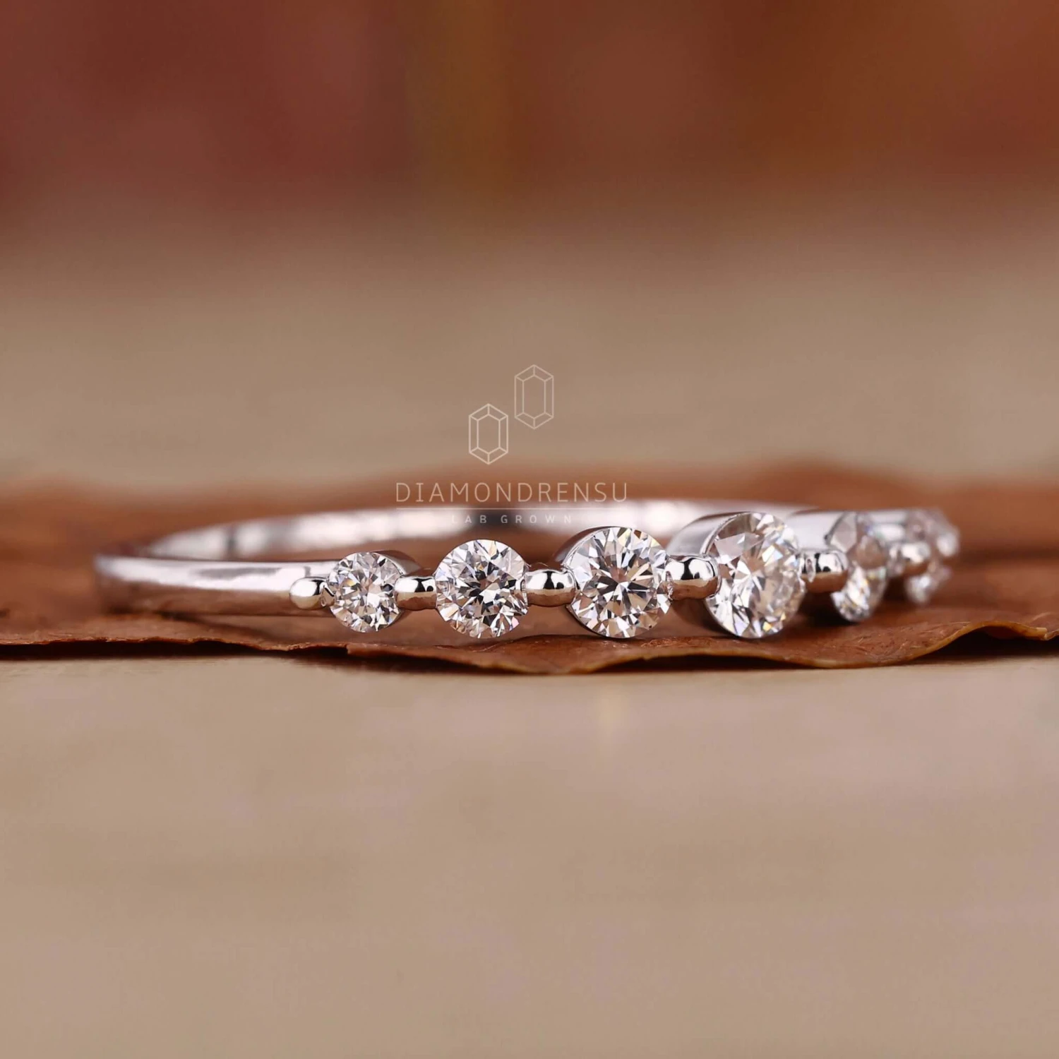 This Seven Stone Diamond Wedding Band is crafted with a floating bubble band and seven round lab grown diamonds, creating an elegant wedding ring for her. Made to last, this diamond wedding band is ethically conscious and perfect for matching with your partner.