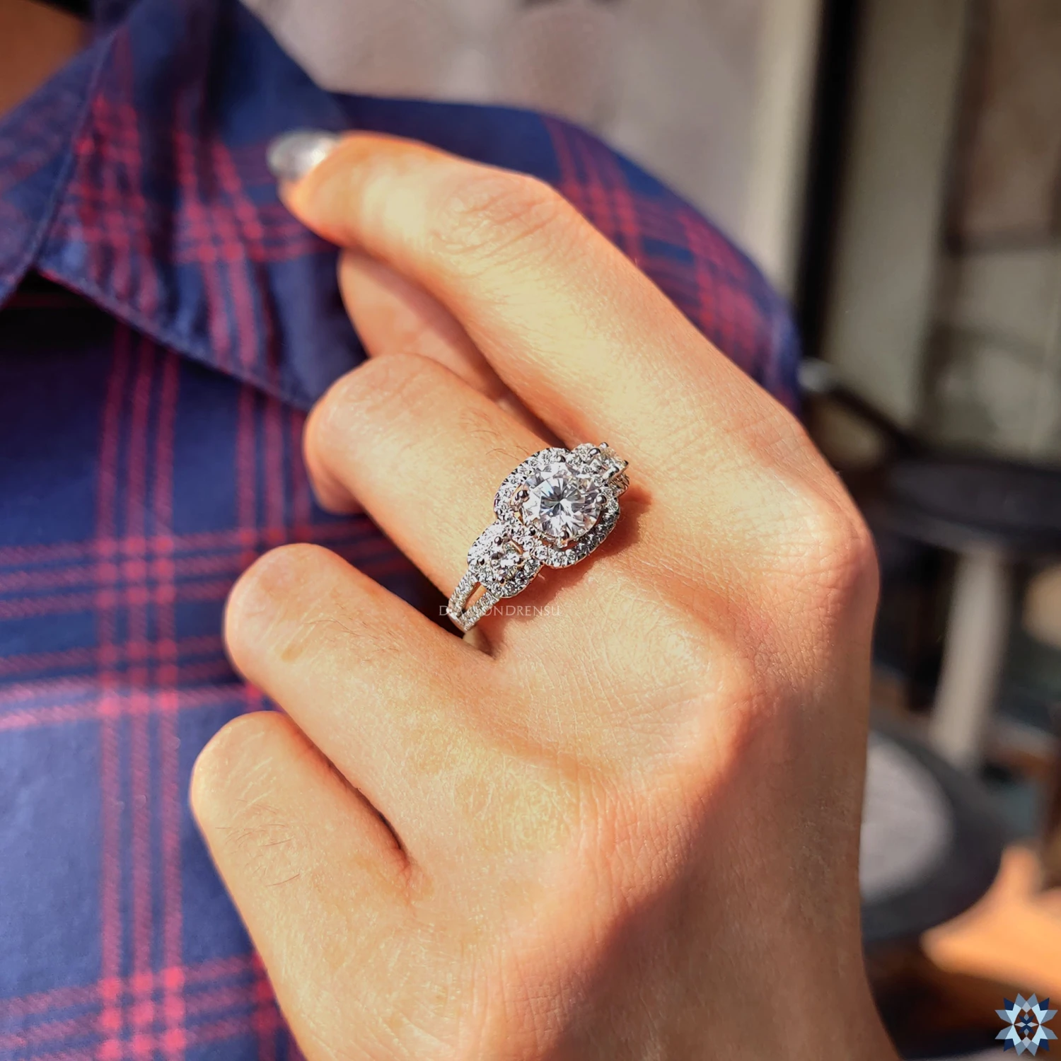 The listed unique moissanite engagement ring comes with the charming round held in a four-prong setting and surrounded by a sparkling cushion outline halo of a tiny round cut. Another beautiful pair of round-cut set each side of the center stone with a halo setting. Furthermore, a split shank adds an extra shiny look to this three stones engagement ring.