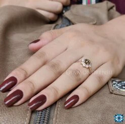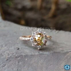 This dazzling affordable moissanite engagement ring features an array of glittering round stones surrounding the center stone and makes it more larger and more beautiful. The Center beauty of the champagne round rose cut adds a sun-rising effect to the moissanite engagement ring. Petite pave set of round cut sparkling stones wraps halfway of the shank.