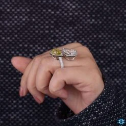 This idol Toi ET Moi unique moissanite engagement ring comes into view sparkling two pear cut moissanite stones. These two yellow and colorless pear cut moissanite are surrounded by minimalist rounds. This listed moissanite halo engagement ring includes three sided pave shank looks decorative and elegant because that one row of pave band has adjusted in the middle of the band, and the other two rows have adjusted on each side of the shank. These two pear moissanite stones twinkle with their fancy canary yellow and white color.