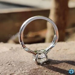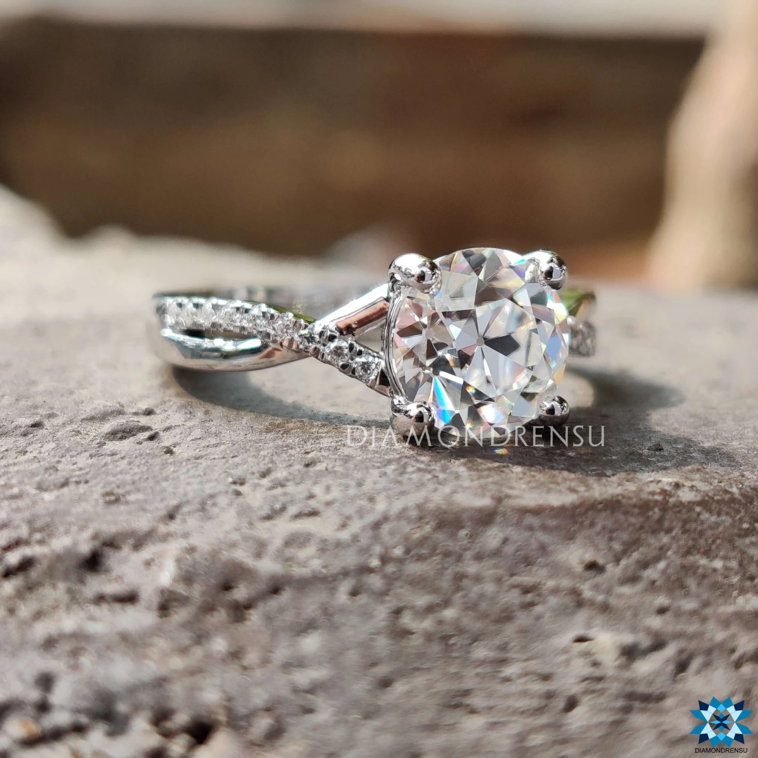 This moissanite engagement ring comes with colorless old European cut moissanite captured by four prongs. In addition, the contemporary twisted shank, one shank covered by precious metal, and another surrounded by little beauty of round. This classic twisted shank gives a unique look to the engagement ring.