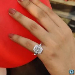 The listed moissanite engagement ring features the center beauty of sparkling emerald cut moissanite. Emerald shape outline halo of round and baguette cut moissanite beautifully surrounded the center stone. This antique shape halo setting gives a vintage touch to the engagement ring. In addition, tapered pave shank of tiny three round cut moissanite set each side of the center stone and gives extra charm to the ring.